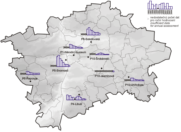 11.7.2023 — Obr. Roční průměrné koncentrace benzenu v ovzduší v letech 1999–2004