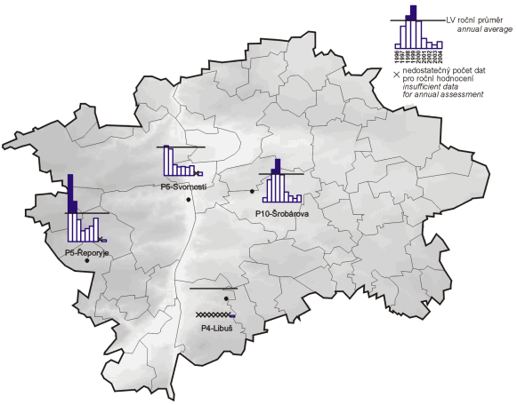 11.7.2023 — Obr. Roční průměrné koncentrace olova v ovzduší v letech 1996–2005