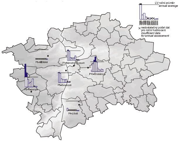 11.7.2023 — Obr. Roční průměrné koncentrace benzenu v ovzduší v letech 1999–2005