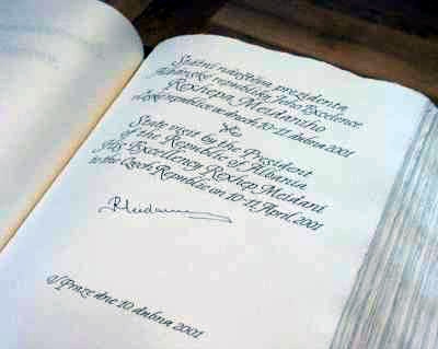 Primátor Jan Kasl přijal včera prezidenta Albánské republiky Rexhepa Meidani v Brožíkově síni Staroměstské radnice. Přivítal vzácnou návštěvu a připomněl historické památky a vyslovil politování, že počasí není tak příznivé, aby město ukázalo tu nejkrásnější tvář. „Snažíme se, aby Praha, ležící na křižovatce cest z východu na západ, ze severu na jih, byla přátelská, otevřená všem návštěvníkům, kteří přijíždějí s dobrou vůlí,“ řekl primátor a zdůraznil: „Jsme velice rádi, že jsme pod jedním deštníkem, deštníkem NATO, a těšíme se, že se vrátíme tam, kam jsme sice vždy patřili, ale odkud jsme museli odejít, že se i formální vrátíme do Evropy, tedy do Evropské unie. V rámci této politiky se snažíme o dobré kontaky se všemi hlavními městy v Evropě. Věříme, že si máme navzájem co říci, a je symbolické, že několik dní před vaší návštěvou jsem dostal dopis od starosty vašeho hlavního města, který by k nám do Prahy měl přijet v polovině července na oficiální návštěvu. Věřím, že i touto formou spolupráce, kontakty mezi oběma městy, se podaří prohloubit vztahy mezi Českou a Albánskou republikou. Těšíme se na další kontakty, na hlubší poznání, těšíme se, že k nám z Albánie přijede více turistů a od nás se více turistů vypraví do Tirany. Pane prezidente, vážení hosté, vítejte v Praze.“Albánský prezident poděkoval za srdečné přijetí, ocenil péči, kterou město a jeho primátor věnuje památkám i rozvoji Prahy. Vyslovil zároveň politování, že nemá tolik času k prohlídce Prahy a cestě po České republice. „Velice mne těší, že budou brzy návázány kontakty mezi radnicemi našich hlavních měst, což jistě přispěje k tomu, aby se jejich obyvatelé poznávali, seznamovali se s historií, kulturou Prahy a Tirany. To vše, jsem přesvědčen, pomůže spolupráci mezi našimi národy,“ řekl prezident Rexhep Meidani. Poté požádal primátor Jan Kasl vzácného hosta o podpis do Zlaté knihy města Prahy a předal mu symbolický klíč od hlavního města. Po slavnostním přípitku si albánský prezident prohlédl v doprovodu pražského primátora historické prostory Staroměstské radnice.