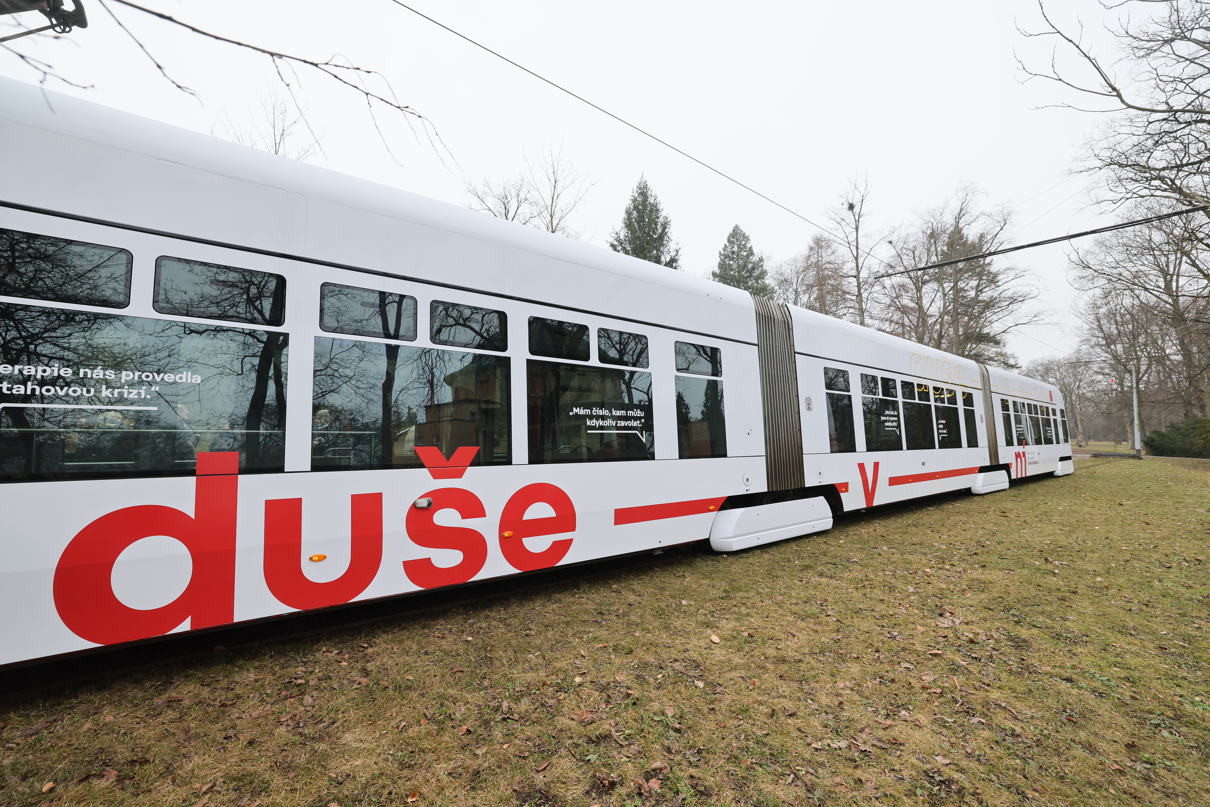 „Duševní tramvaj“ je laděná do bílé barvy s červeným nápisem „Duše-v-ní“ a doplňují ji citáty, které připomínají, jak důležité je nebýt na obtíže sám a nebát se vyhledat odbornou pomoc, například „mám číslo, kam můžu kdykoliv zavolat,“ nebo „je dobré nebýt na to sám“. Cestující v ní v následujících týdnech najdou vizuály kampaně, informace k tématu i městským organizacím Zahrada pro duši a Centrum sociálních služeb Praha – a také přehled ověřených kontaktů, kde mohou jednoduše, bezpečně a bez obav získat podporu v oblasti duševního zdraví.