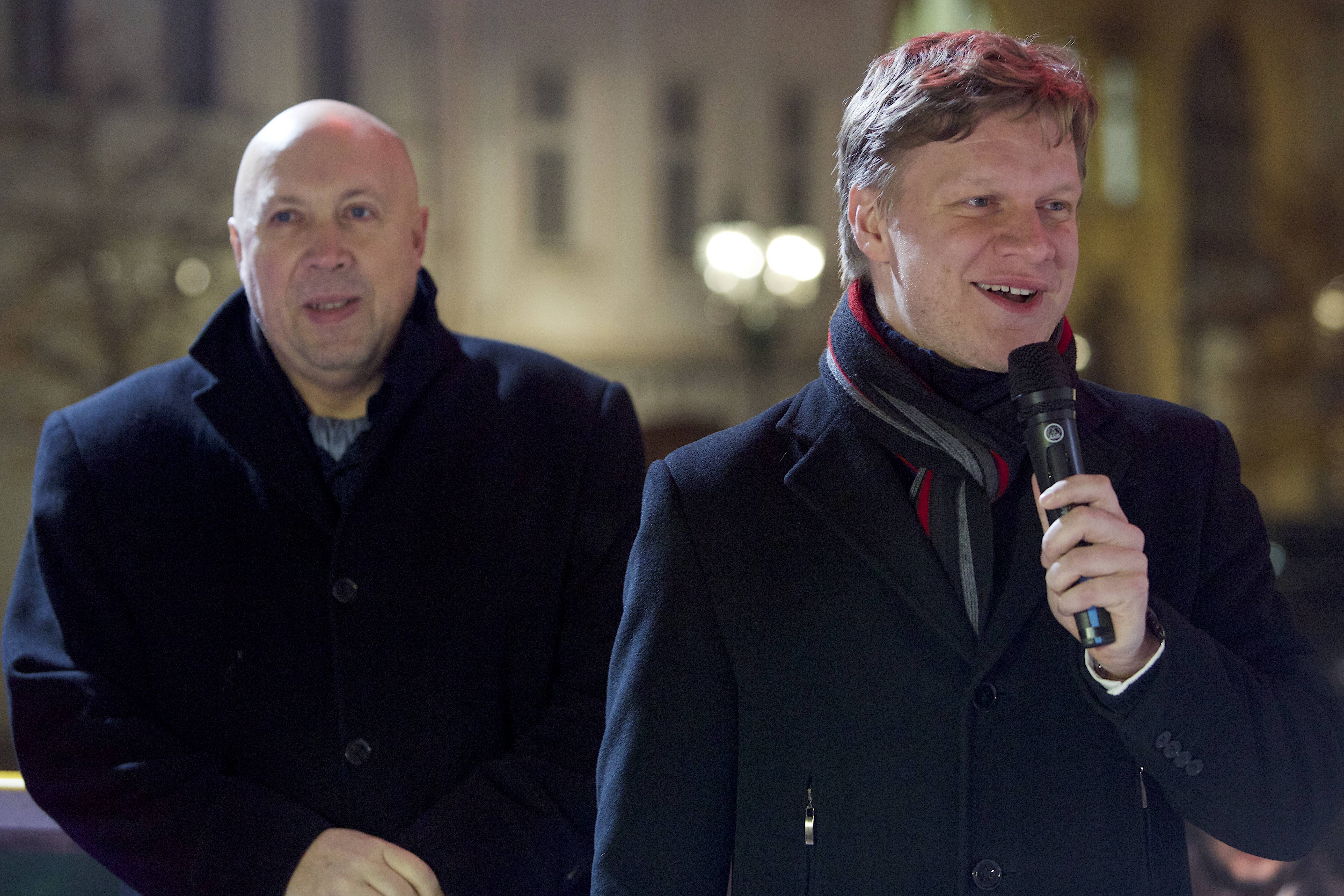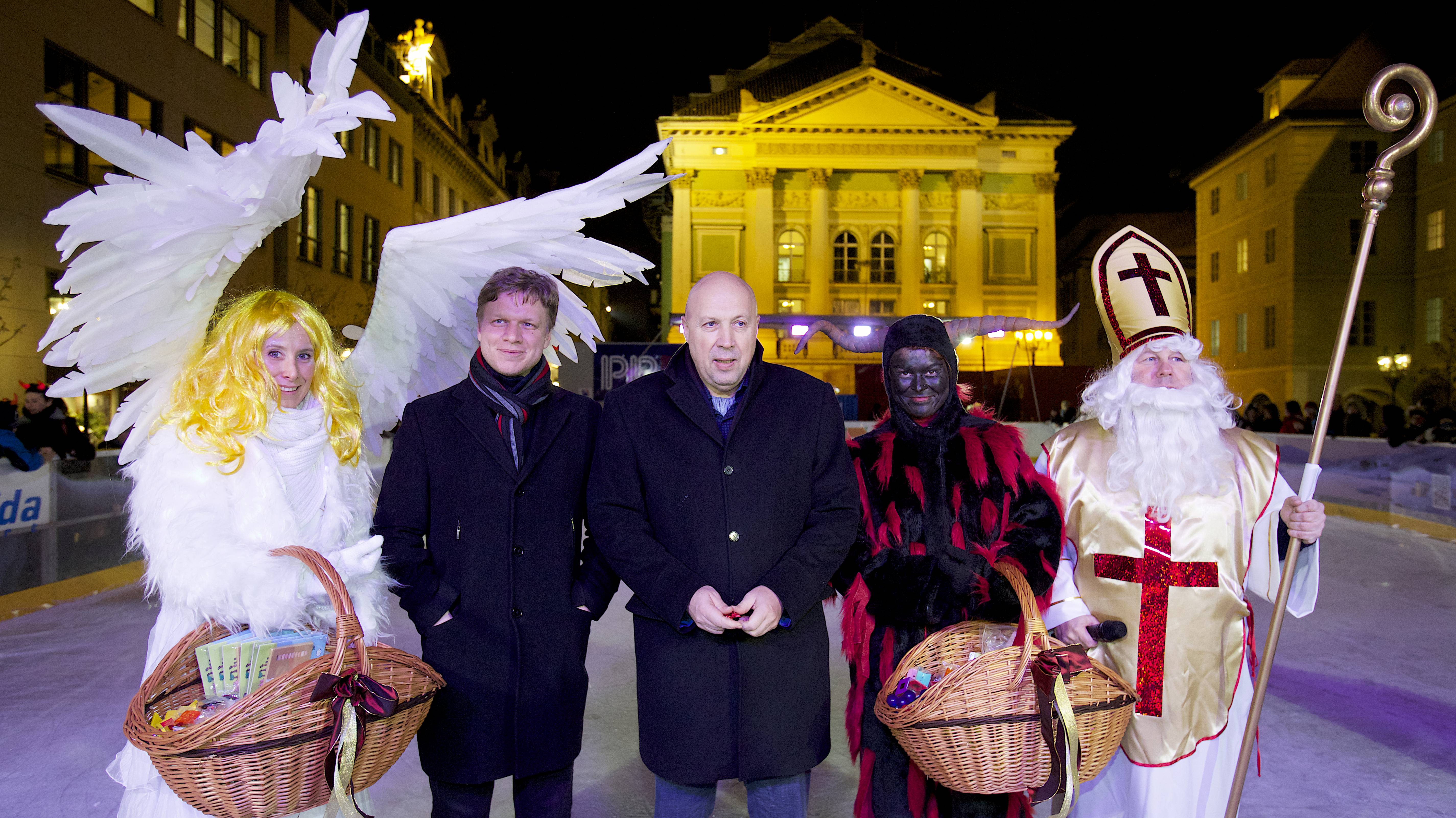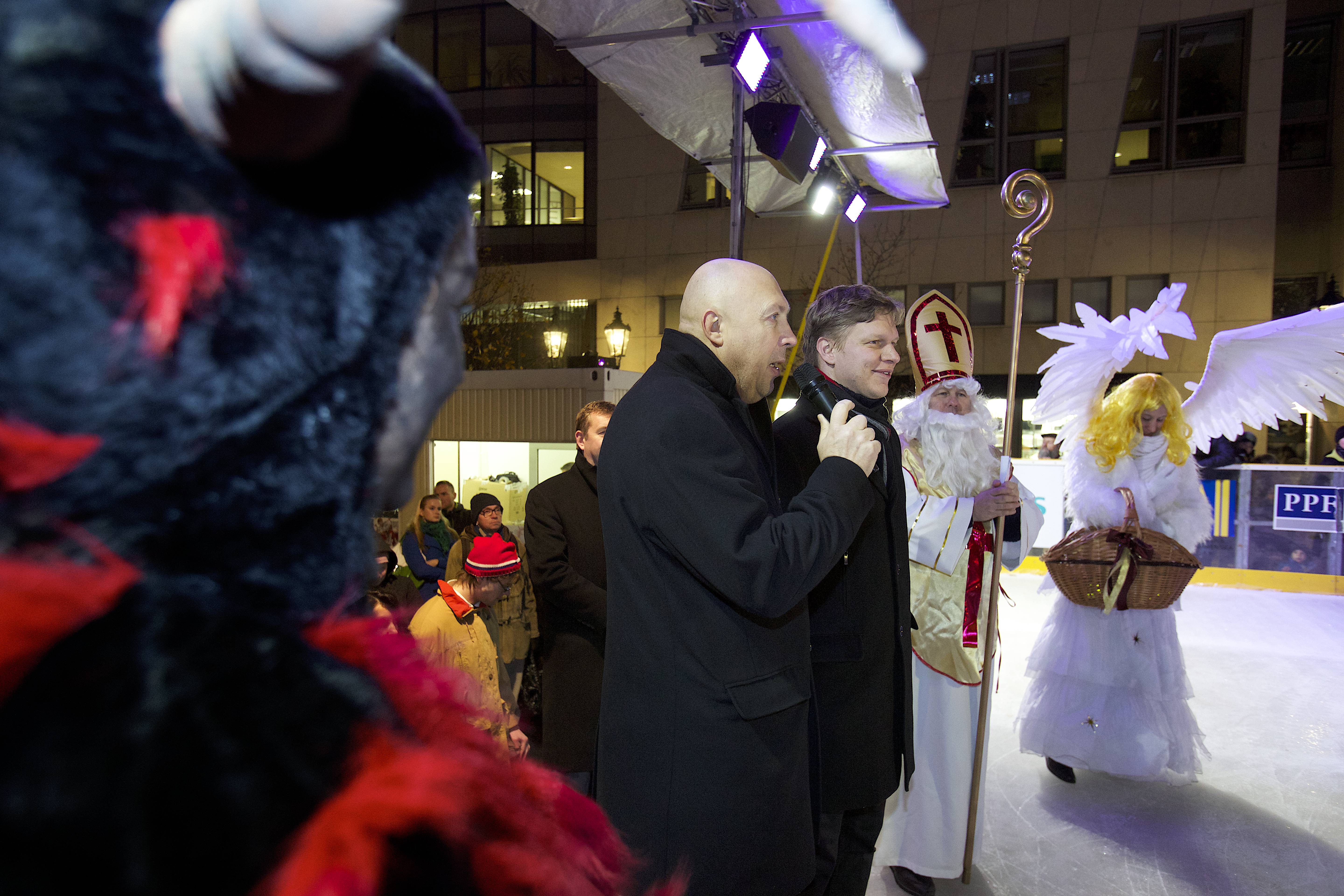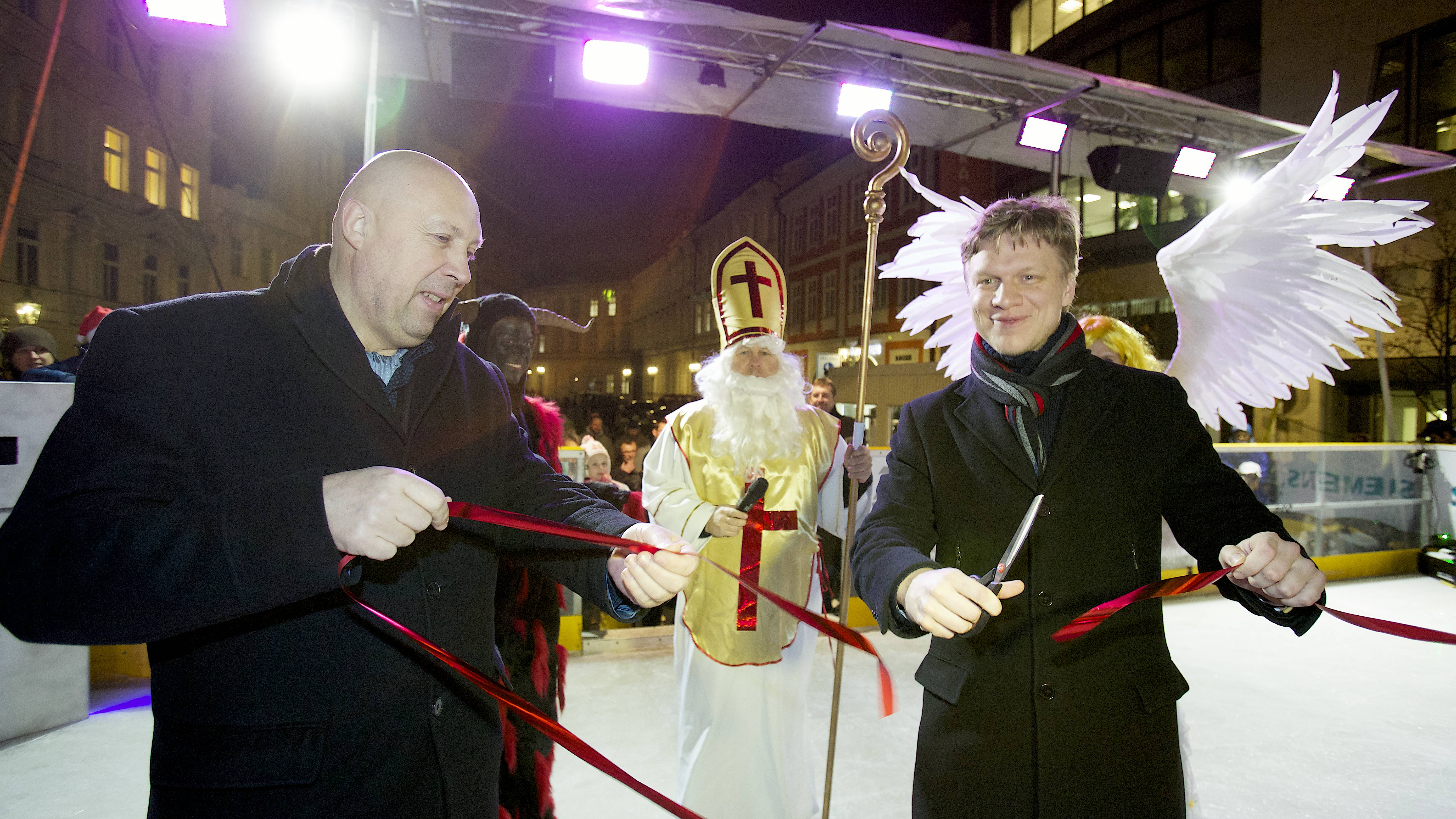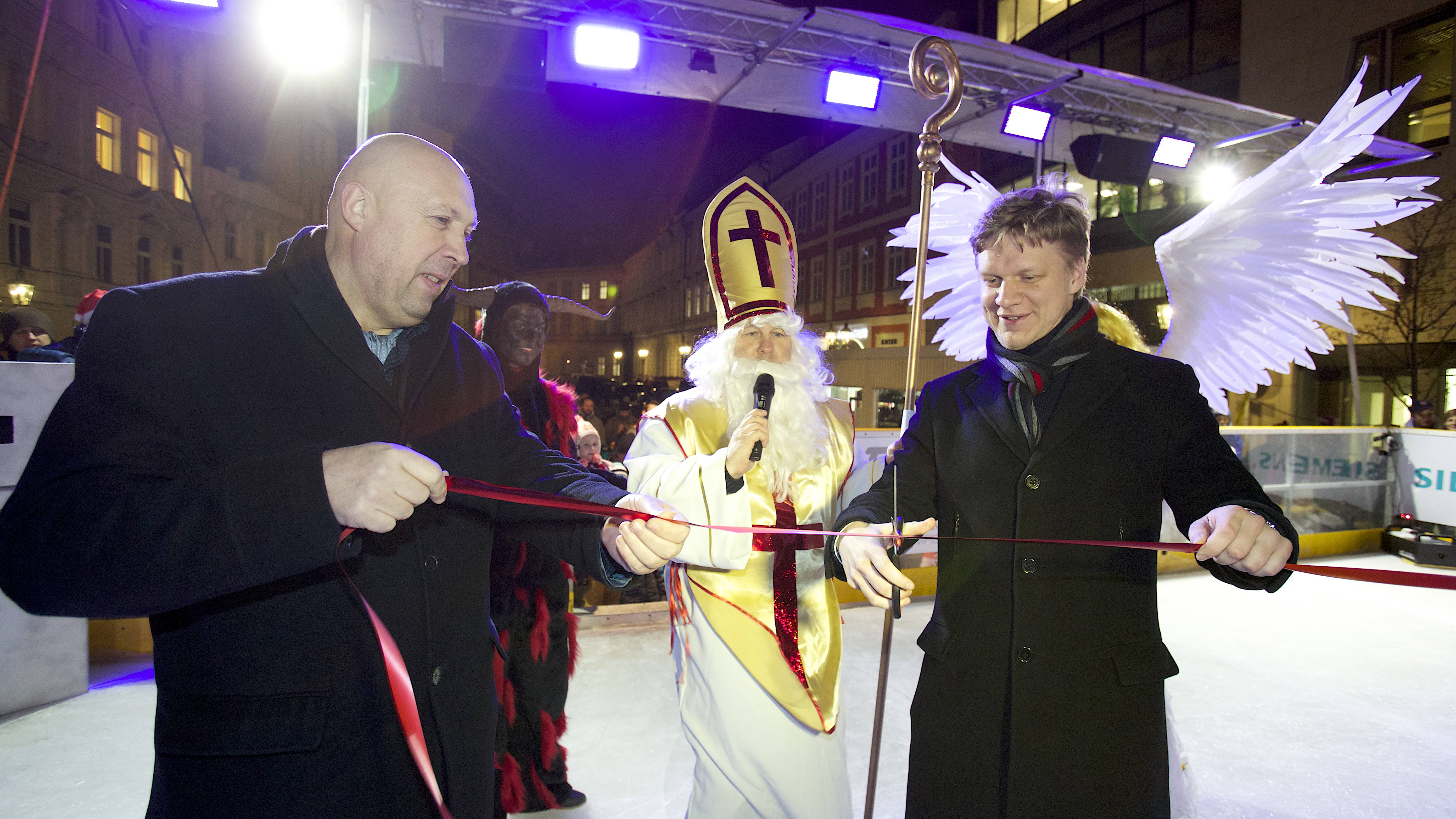 Pražský primátor Tomáš Hudeček včera slavnostně otevřel tradiční kluziště na Ovocném trhu. Společně s ním se otevření zúčastnil také radní Lukáš Manhart a starosta Prahy 1 Oldřich Lomecký.
