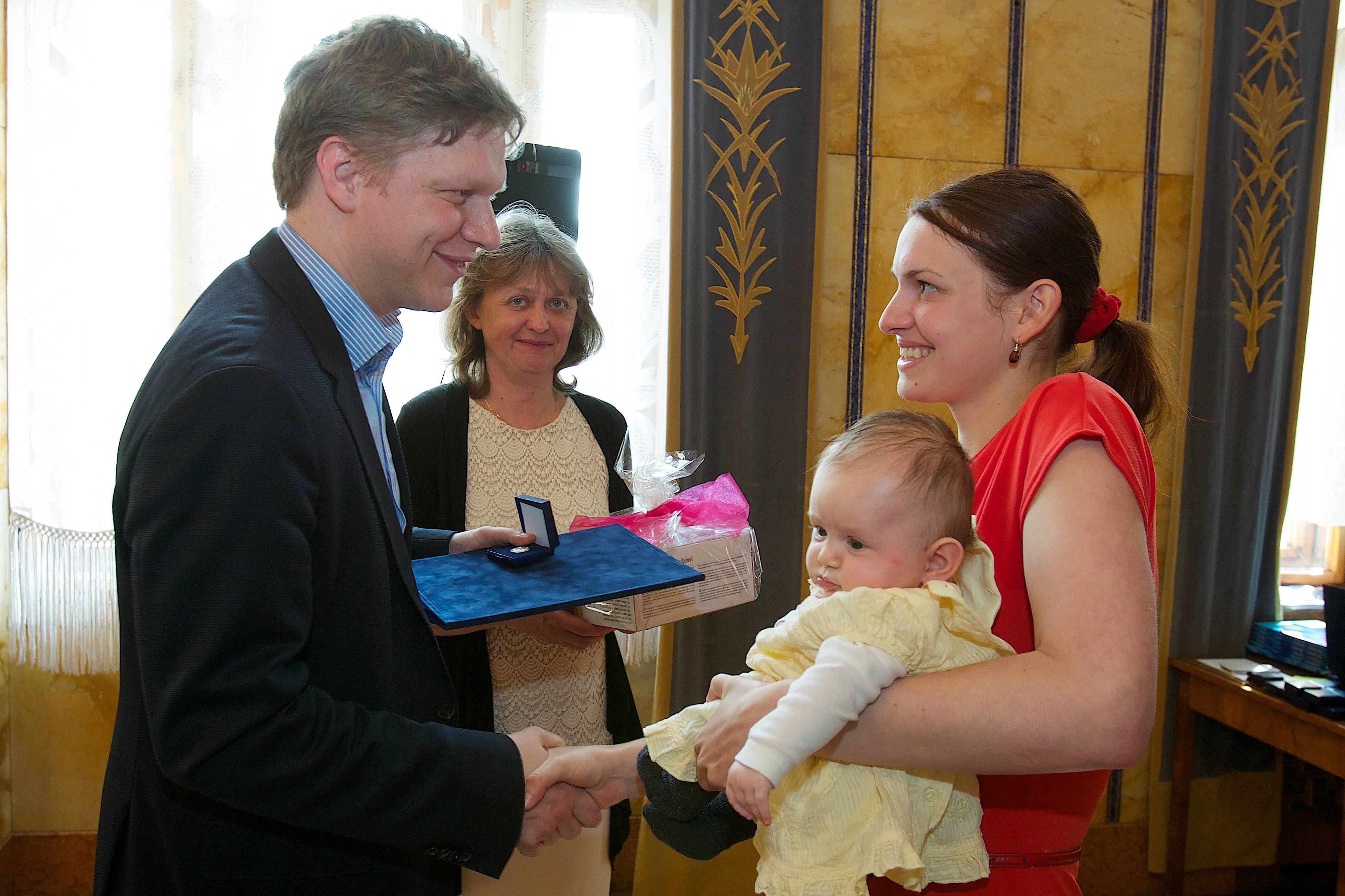 Primátor předal rodičům dětí obálku s peněžitým darem 15.000 korun, pamětní list se jménem narozeného občánka, stříbrnou minci, dětskou jídelní soupravu a knihu Broučci od Jana Karafiáta. Maminky dostaly také kytici.