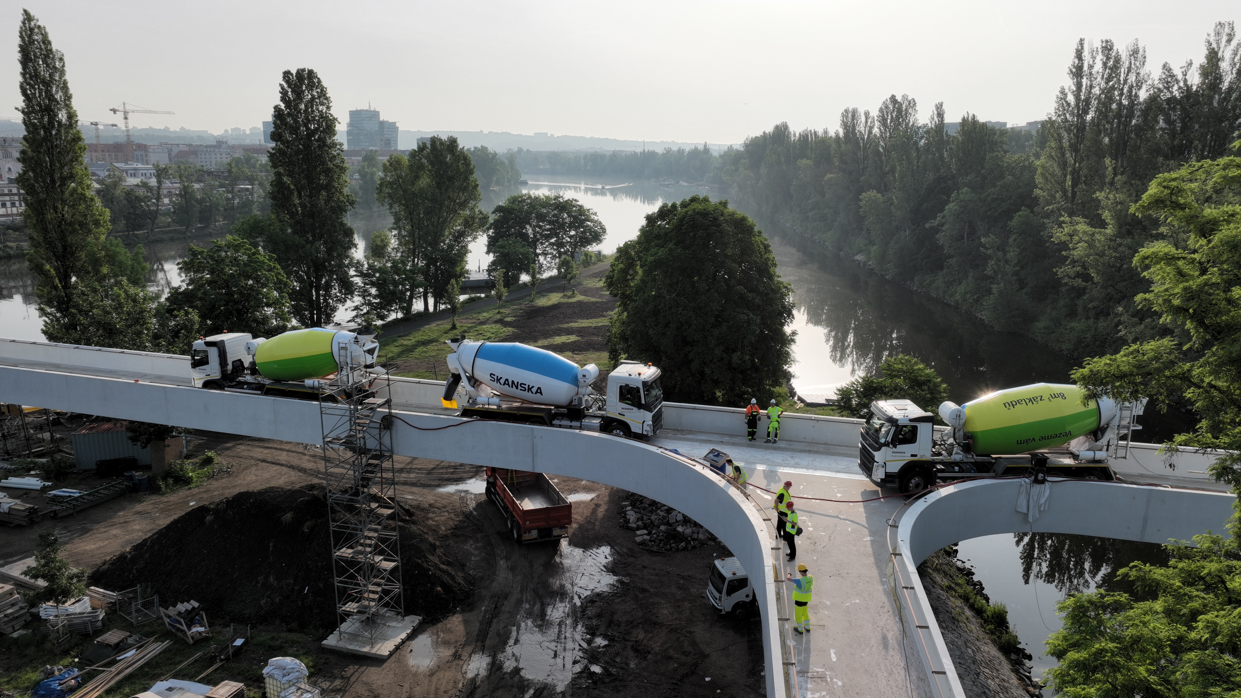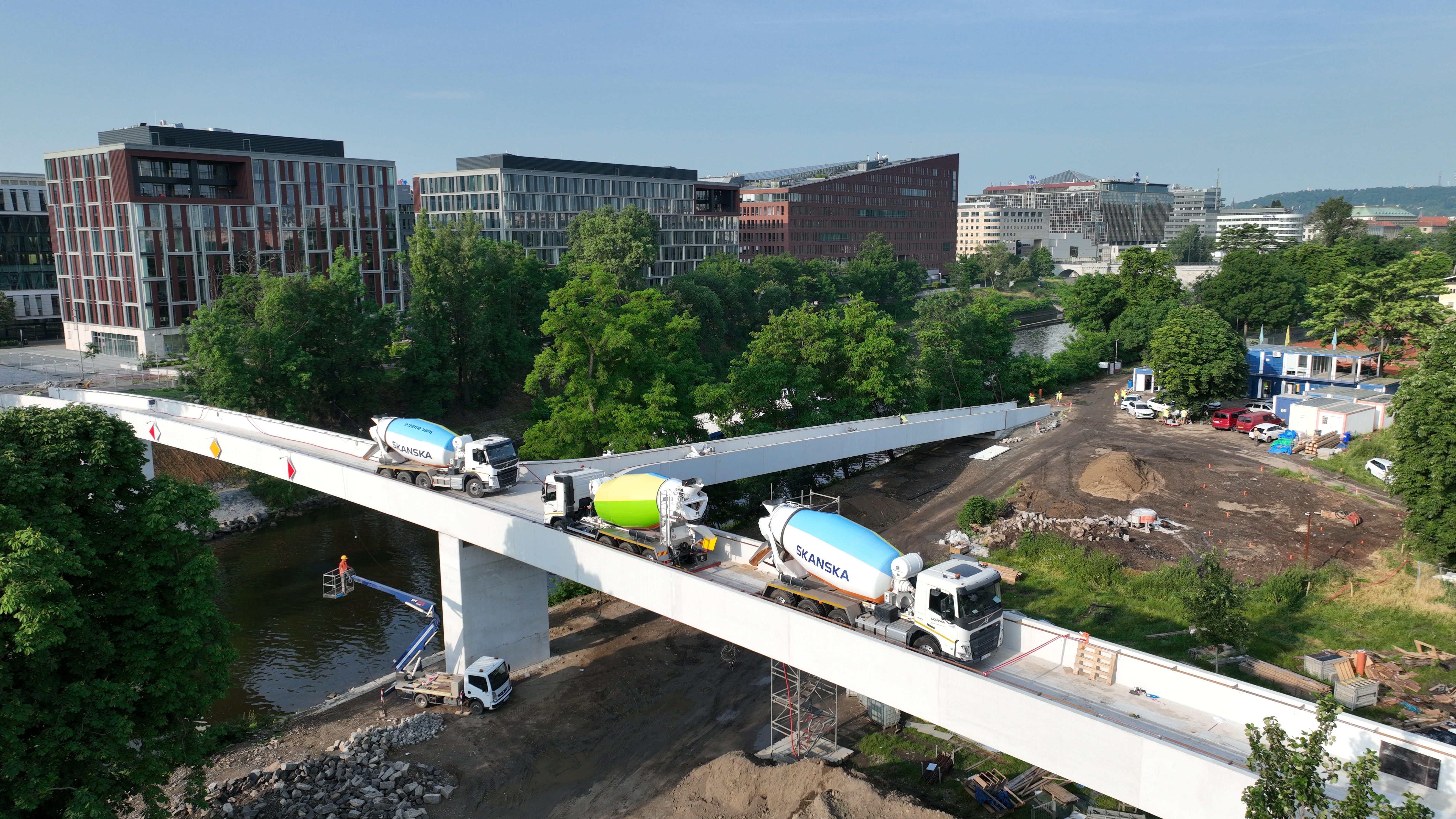 Téměř dokončená lávka, která v létě spojí Holešovice s Karlínem přes ostrov Štvanice má za sebou náročné zatěžovací zkoušky. Mostní specialisté Skanska zatížili konstrukci nákladními auty a před tím ji kontrolovaně rozkmitali, aby simulovali její extrémní zatížení. Tři sta metrů dlouhý most pro pěší a cyklisty se otevře v létě.
