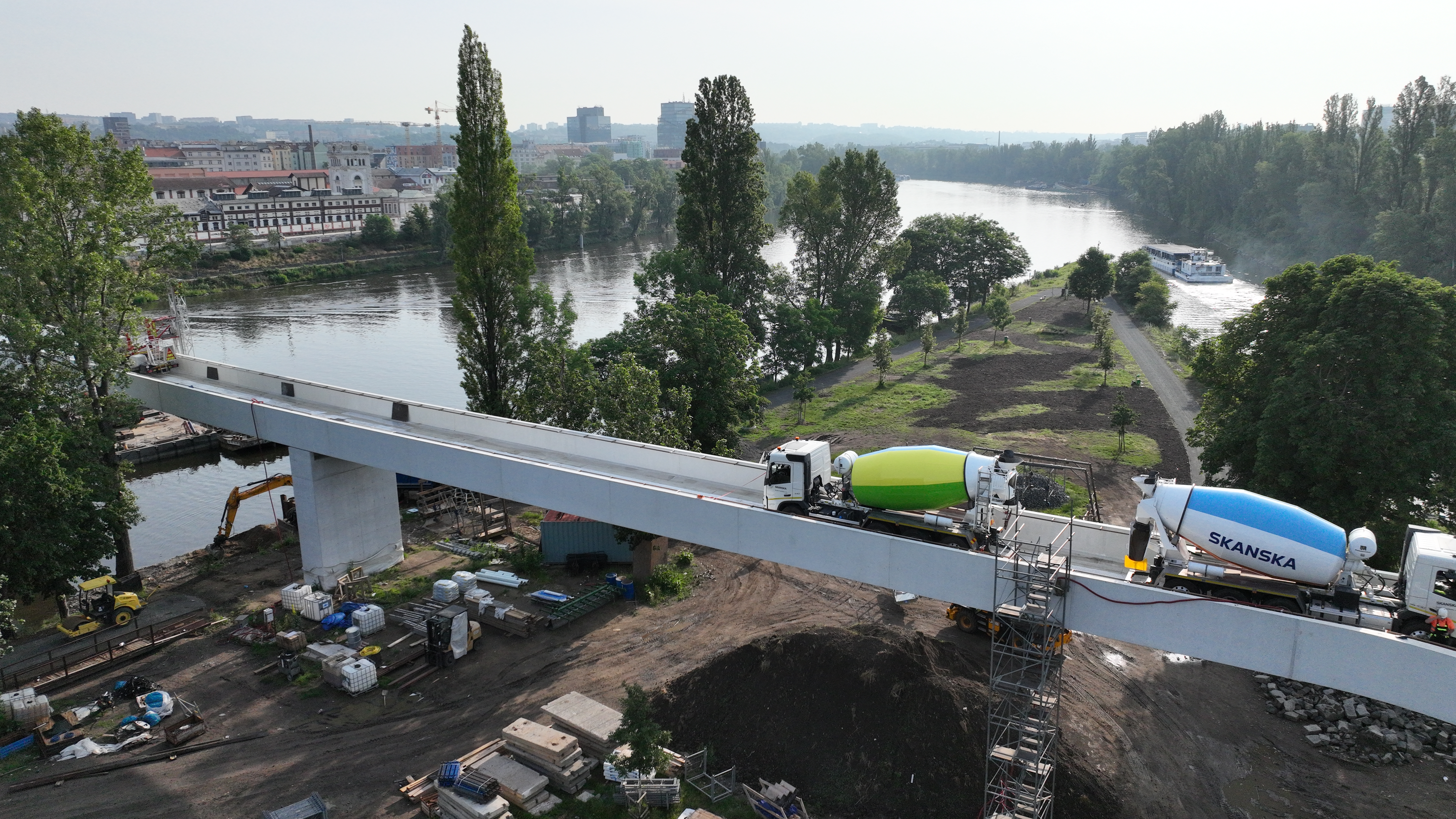 Konstrukce lávky je už hotová, je usazeno zábradlí s osvětlením a pracuje se na napojení na okolní komunikace a terénních úpravách. Aktuálně nejdůležitější jsou na stavbě statické a dynamické zatěžovací zkoušky. „Pro statické zkoušky jsme použili nákladní auta o celkové hmotnosti přes 70 tun, na dynamické zkoušky máme takzvaný budič kmitů s půltunovým závažím – data z obou zkoušek využijeme pro přesné nastavení tlumičů kmitání, které budou v lávce zabudovány. Ihned po zkouškách také začneme s finální úpravou povrchů,“ uvádí projektový manažer Skanska Michal Kunc.