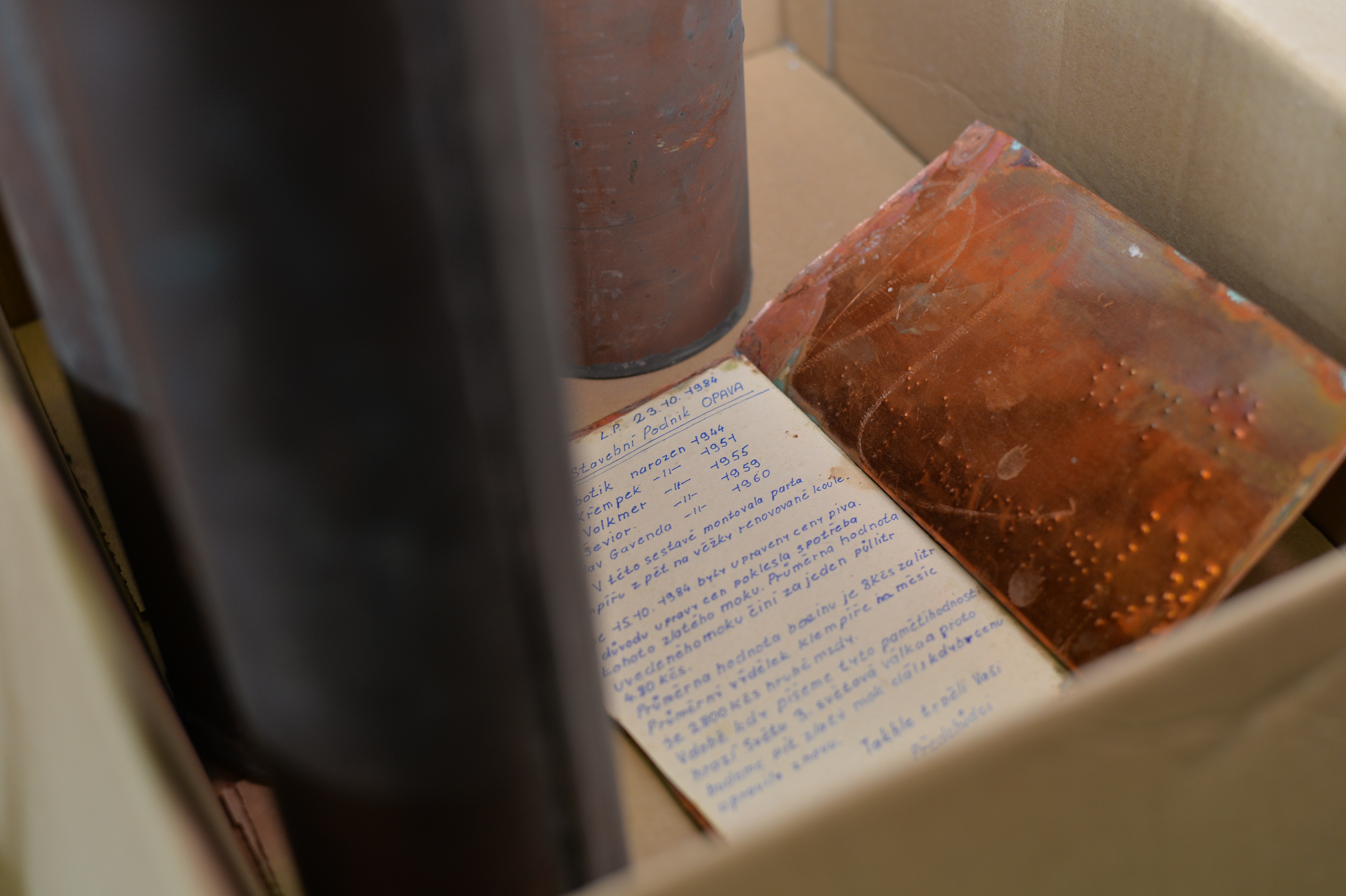 Rovněž na rok 1984 upomínají dobové noviny a také mince a v ploché schránce vzkaz řemeslníků, kteří zde pracovali na opravě.