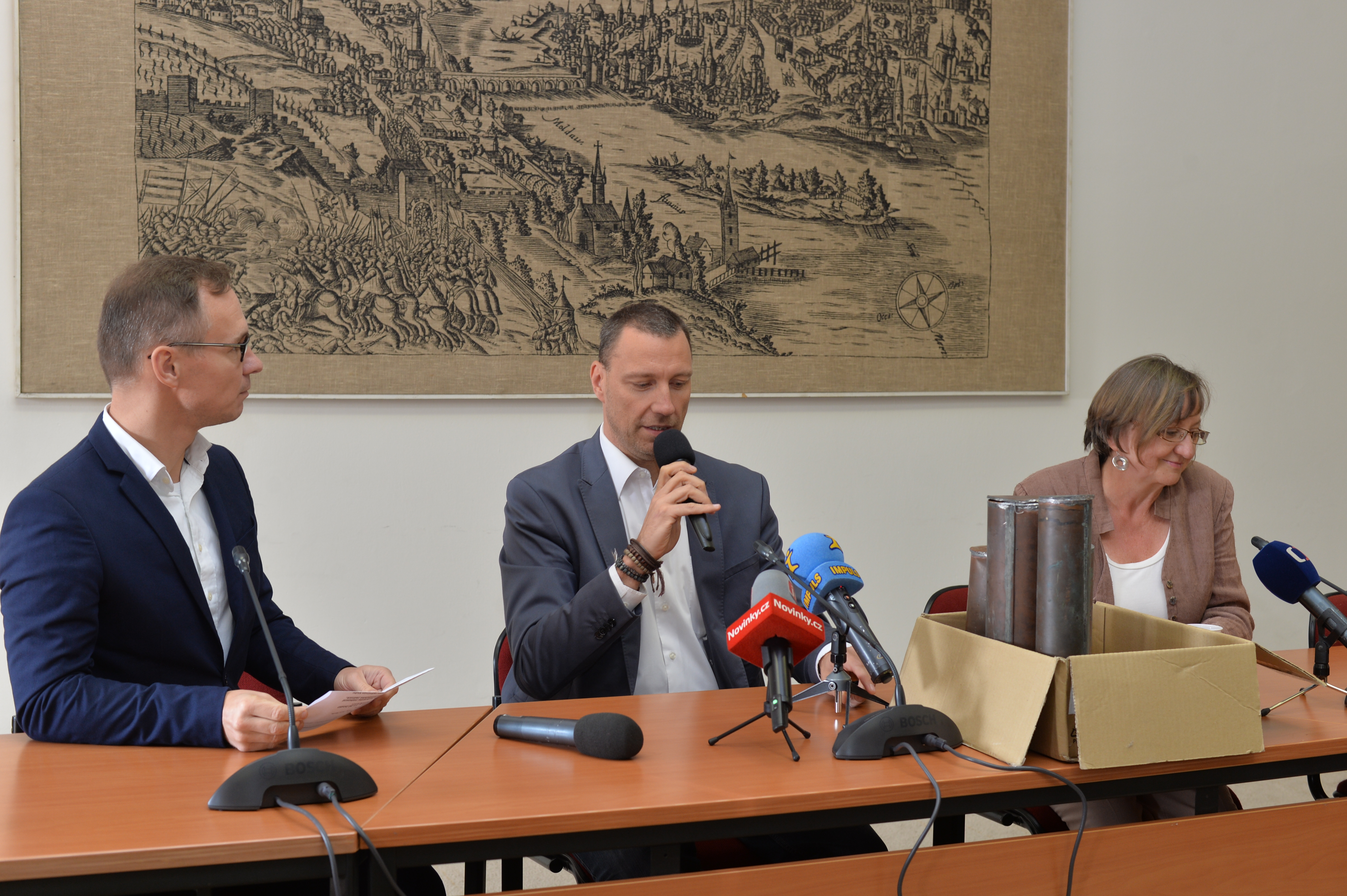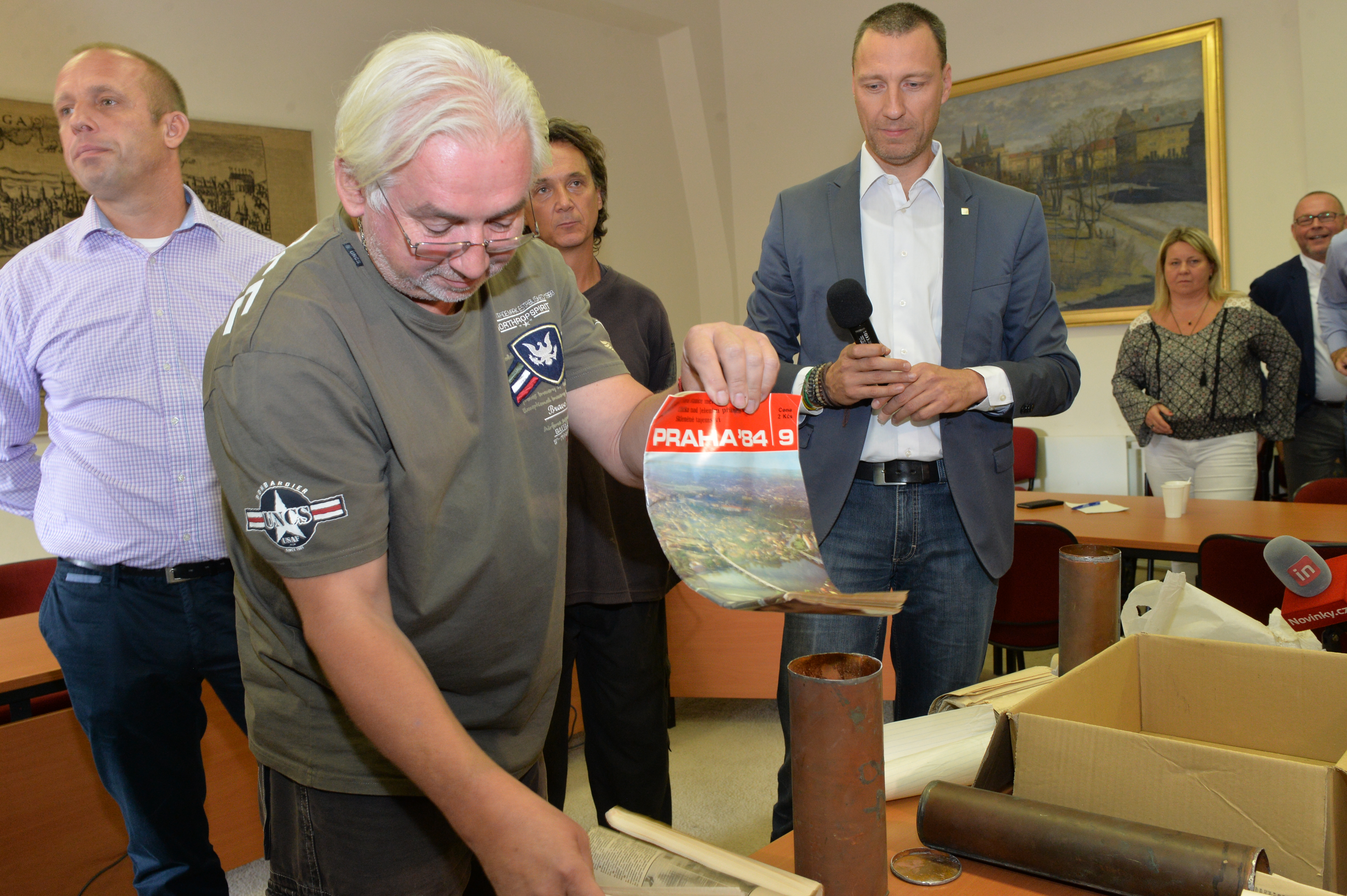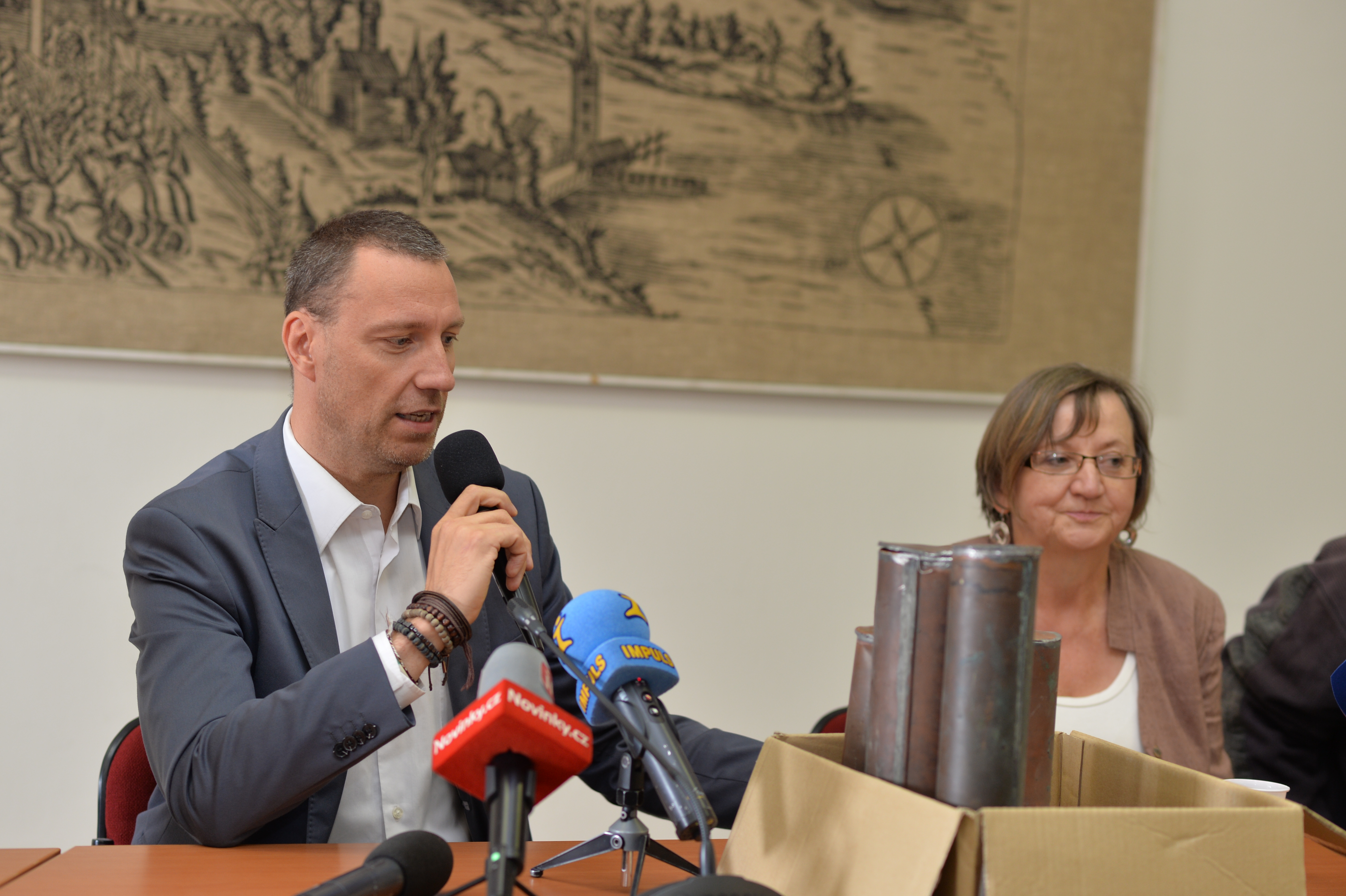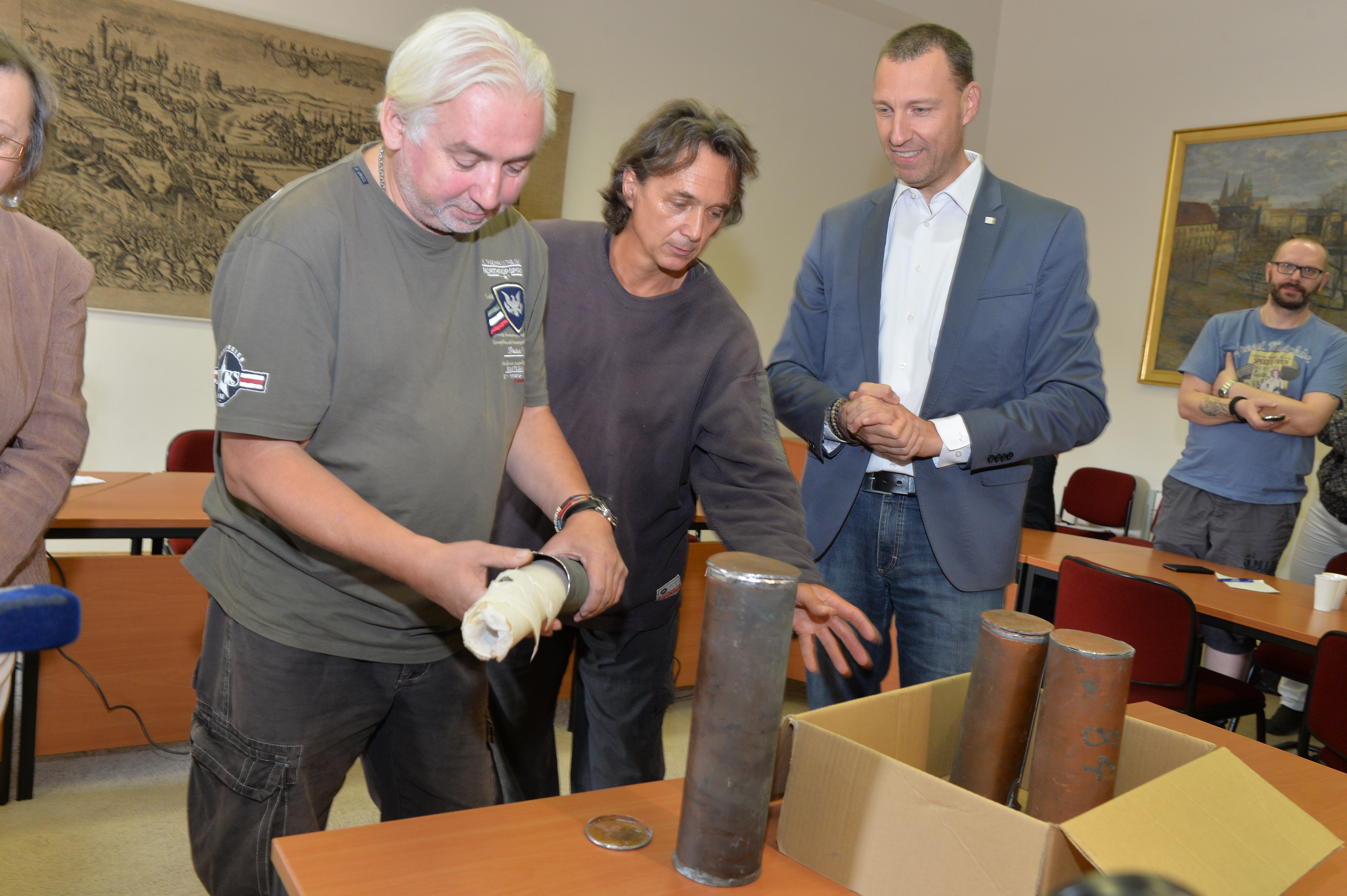 Obsah měděných tubusů vyjmutých v úterý z makovic věže Staroměstské radnice představil dnes médiím za přítomnosti odborníků radní hl. m. Prahy Jan Wolf.