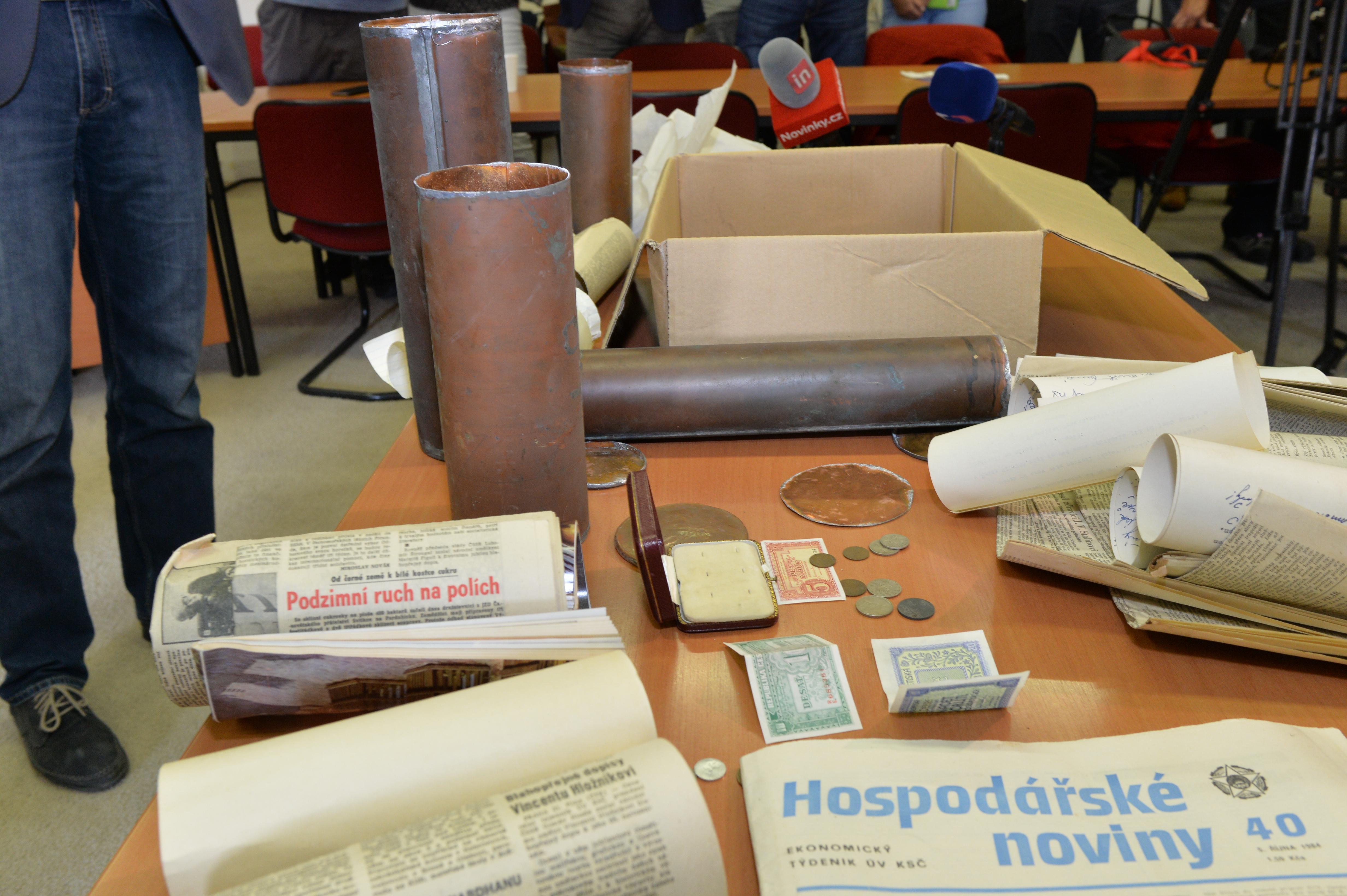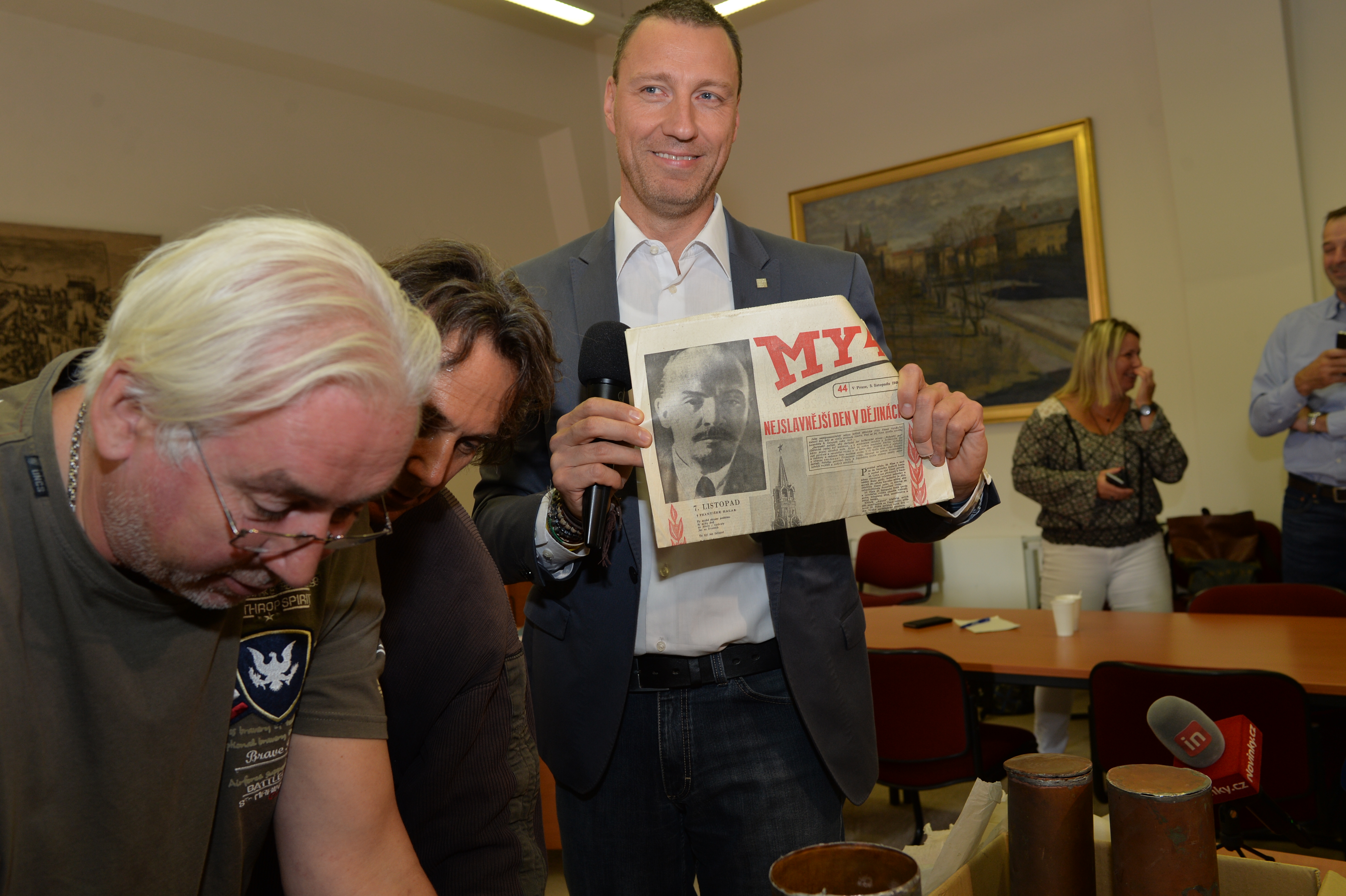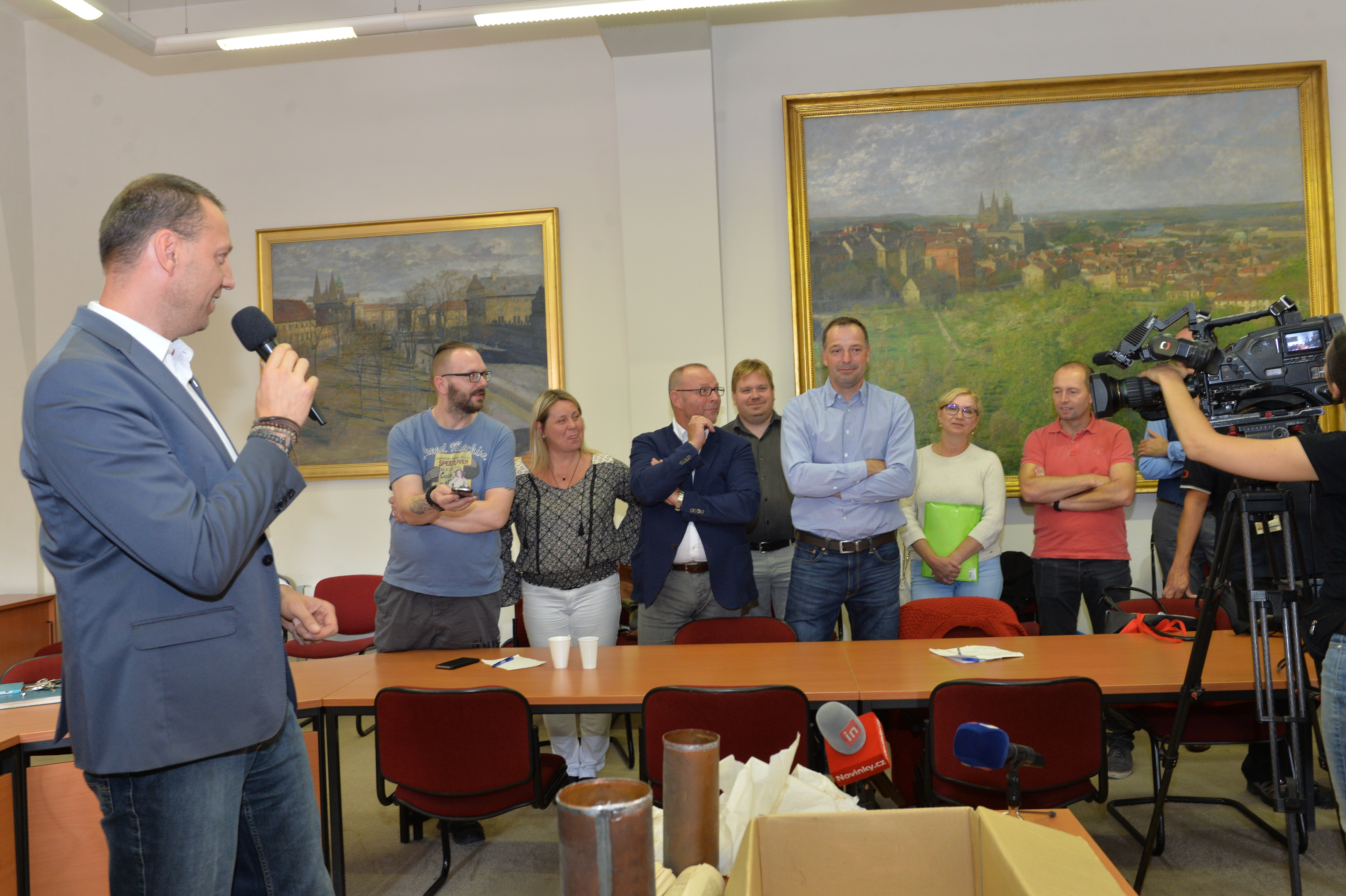 Obsah měděných tubusů vyjmutých v úterý z makovic věže Staroměstské radnice představil dnes médiím za přítomnosti odborníků radní hl. m. Prahy Jan Wolf.