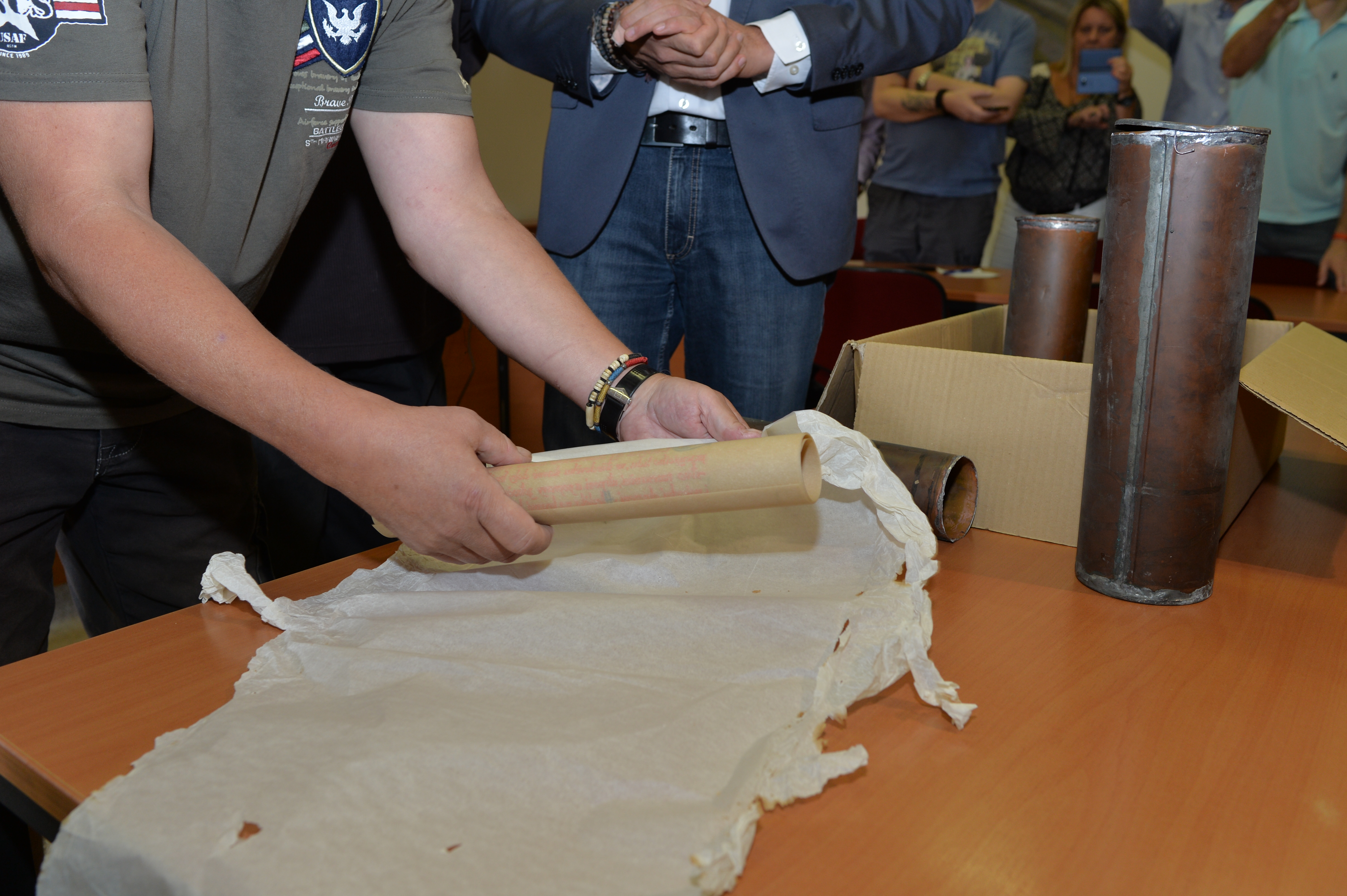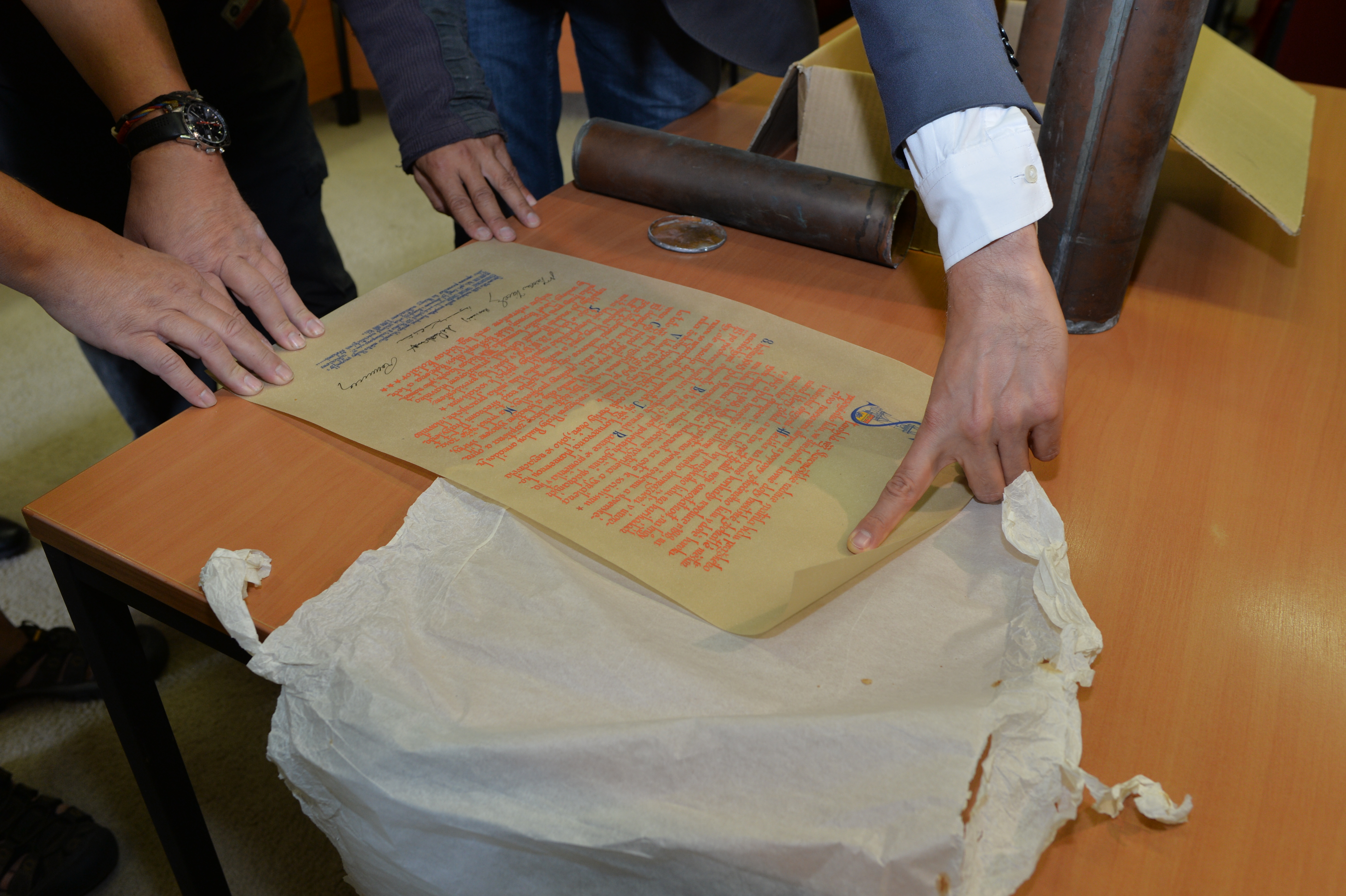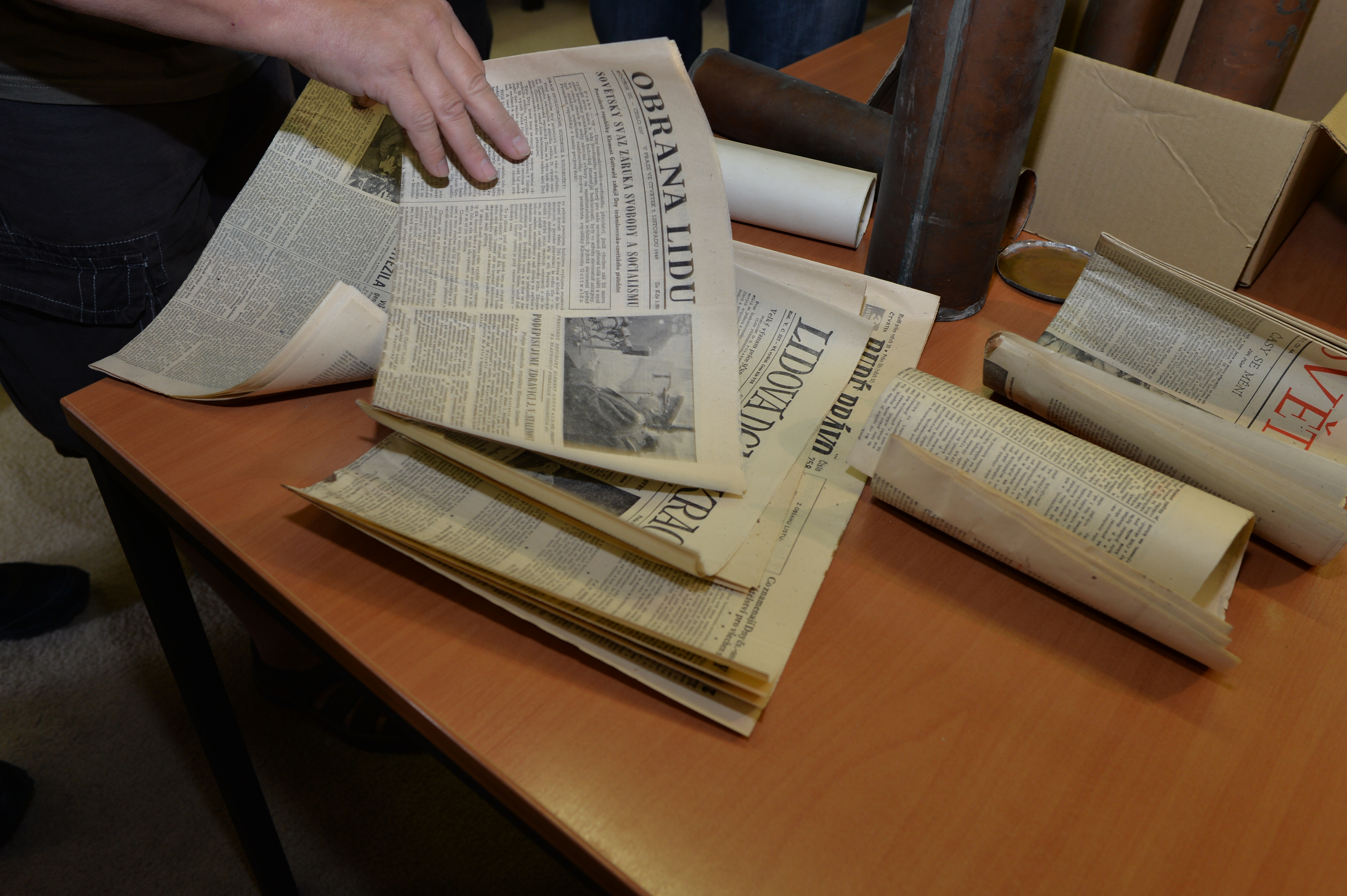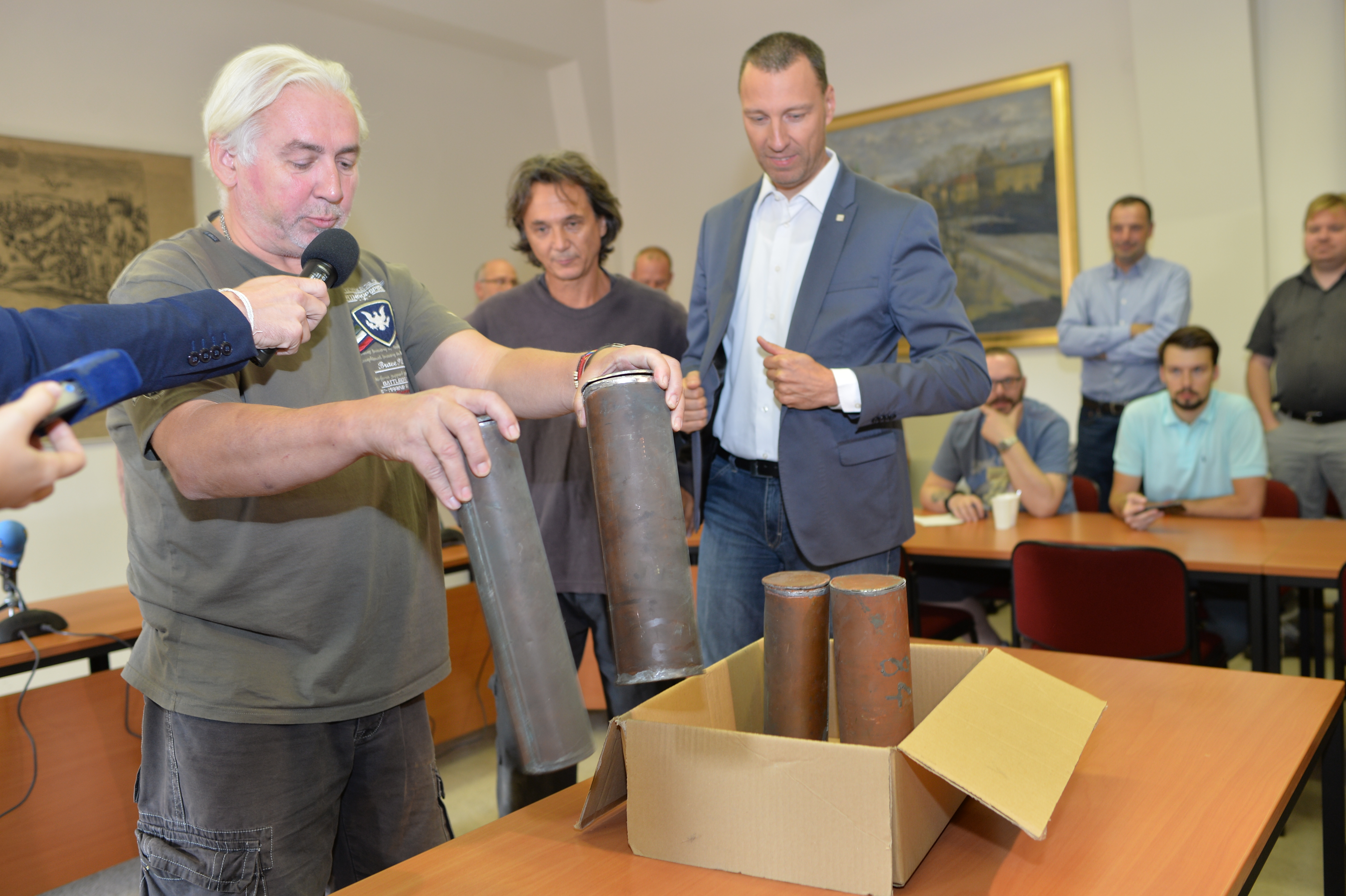 Obsah měděných tubusů vyjmutých v úterý z makovic věže Staroměstské radnice představil dnes médiím za přítomnosti odborníků radní hl. m. Prahy Jan Wolf.