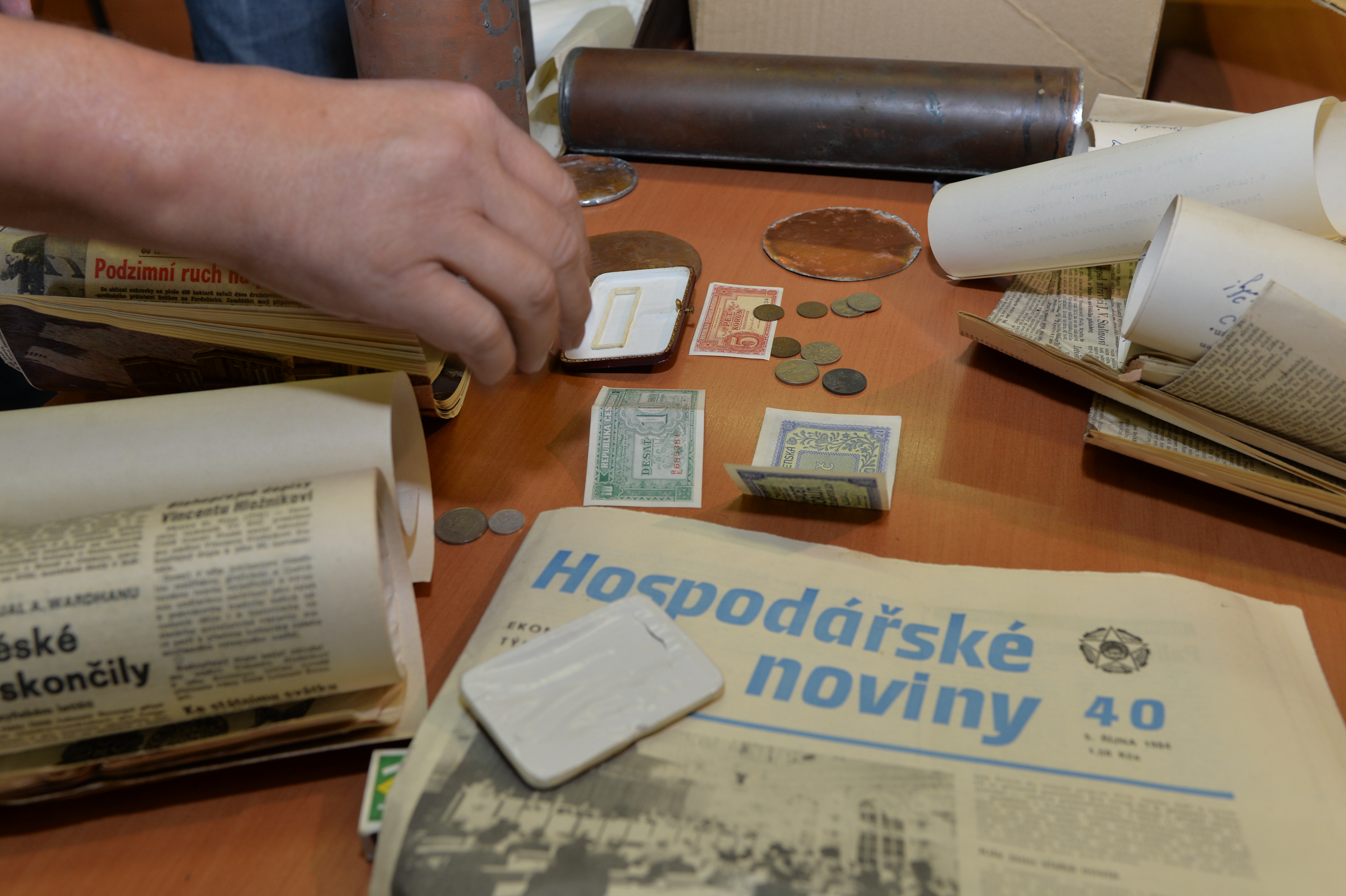 Z prvního tubusu byl opatrně vyňat svitek papíru a po rozbalení jej přečetl radní Jan Wolf: „Na vrchol věže zasazena tato zlacená makovice, aby znovu zazářila nad střechami Prahy, tentokrát skutečné hlavy země a svého lidu, města pracujících, hlavního města lidově demokratické republiky spějící k socialismu.“ Ručně psaný dokument nese datum 28. října 1949 a podpisy tehdejšího primátora a radních. K témuž roku, kdy byla dokončena poválečná oprava Staroměstské radnice, se vztahují i další památky – ručně psaná informace o těch, kdo se na opravě podíleli, noviny a také bankovky.