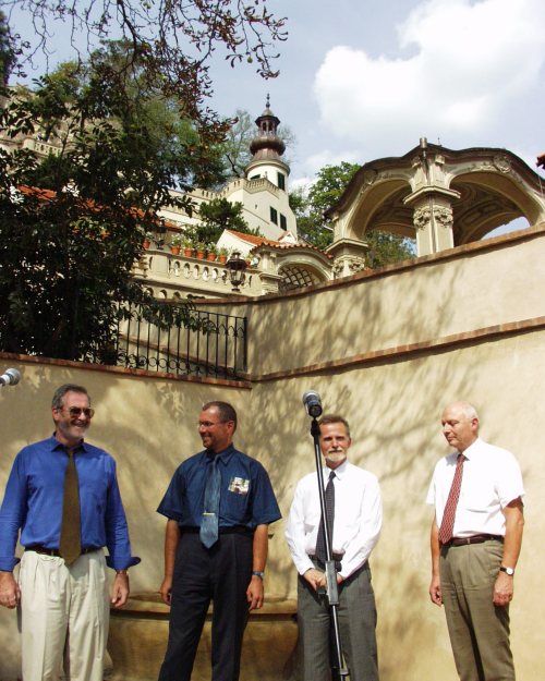 zahrada1 (foto - První návštěvníky obnovených zahrad přivítali (zleva): Michal Prokop, ředitel společnosti Praha - Evropské město kultury roku 2000, první náměstek ministra kultury Zdeněk Novák, ředitel SÚPP Josef Štulc a starosta Prahy 1 Jan Bürgermeister)