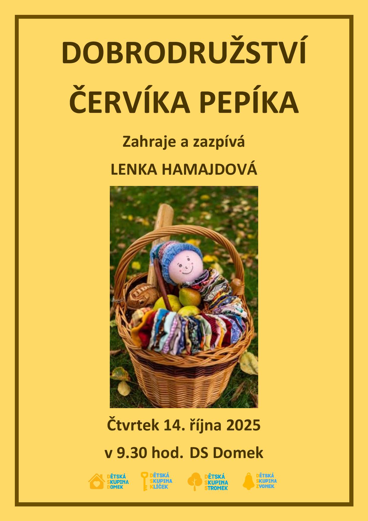 V úterý 14. října nám milá paní Hamajdová přivezla veselé představení o červíkovi Pepíkovi. S dětmi jsme poznali červíka Pepíka a jeho přátele. Pejska, který bydlel v zelené hruštičce a rád se staral o svoji zahrádku. Vedle něj bydleli v krásně červeném jablíčku kocour s kočičkou. Z jezírka na nás vykoukla žabička a o kousek dál byla zabydlená i myška. Zazpívali jsme si se všemi mnoho známých písniček. Například „Skákal pes,“ „Kočka leze dírou,“ i myší písničku. Zatancovali jsme si s kocourem a myškou a také jsme spinkali jako medvědi. Písniček i tancování bylo samozřejmě více, a nakonec jsme si poslechli i píseň o samotném červíkovi Pepíkovi :-)