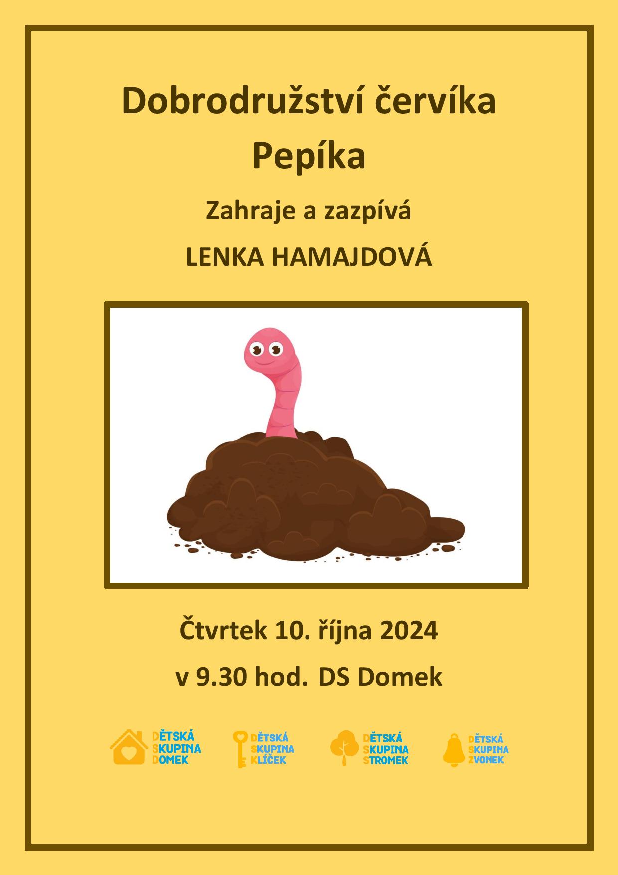 Ve čtvrtek 10. října čeká na děti překvapivý příběh červíka Pepíka, který nám písněmi vyplní Lenka Hamajdová. Svět malého červíka nám ukáže jiný pohled na dění kolem nás. Budeme také potřebovat pomoc dalších zpěváků a hudebníků, kteří se neostýchají společně s Lenkou Hamajdovou vystoupit a o tanec také jistě nebude nouze.