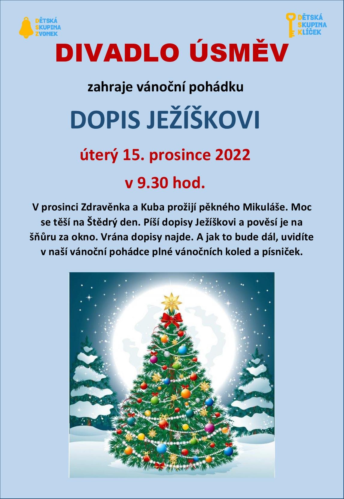 Za dětmi do dětských skupin MHMP poprvé přijedou herci z Divadla Úsměv a přivezou nám ryze vánoční pohádku DOPIS JEŽÍŠKOVI. Pohádkový příběh holčičky Zdravěnky a kluka Kubíka nás zavede do vánočního času a dozvíme se, co všechno děti prožívají. Hraje se v prostorách dětských skupin Zvonek a Klíček během dopoledního bloku.