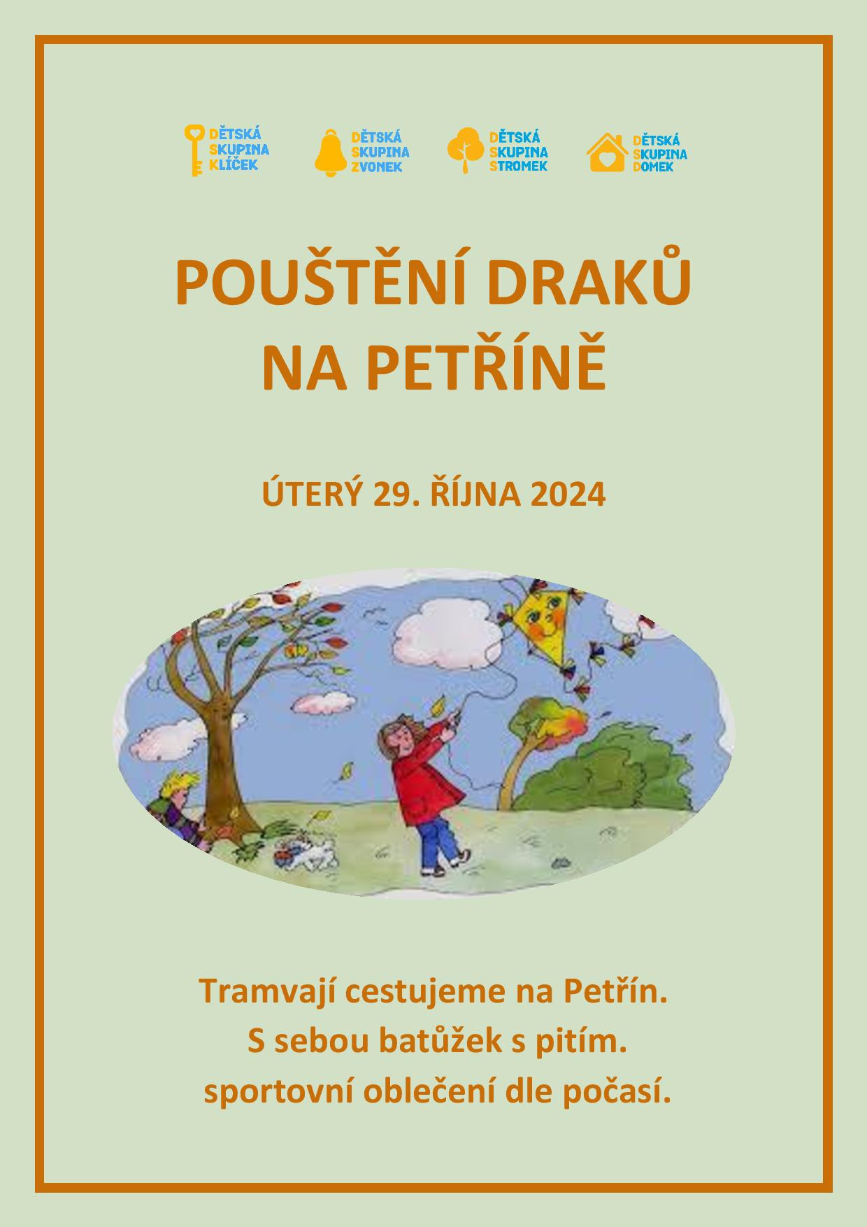 V úterý 29. října 2024 vyšlápneme na svahy Petřína, kde budeme běhat a za námi poletí naši draci. Na Petřín vyrazíme tramvají v rámci dopoledního programu a draci pojedou s námi. Naším cílem je dostat draky do vzduchu a pořádně se u toho vyřádit v krásně barevné podzimní přírodě, kterou budeme vnímat všemi smysly. Určitě budeme potřebovat sportovní oblečení a boty vhodné na běhání v terénu.