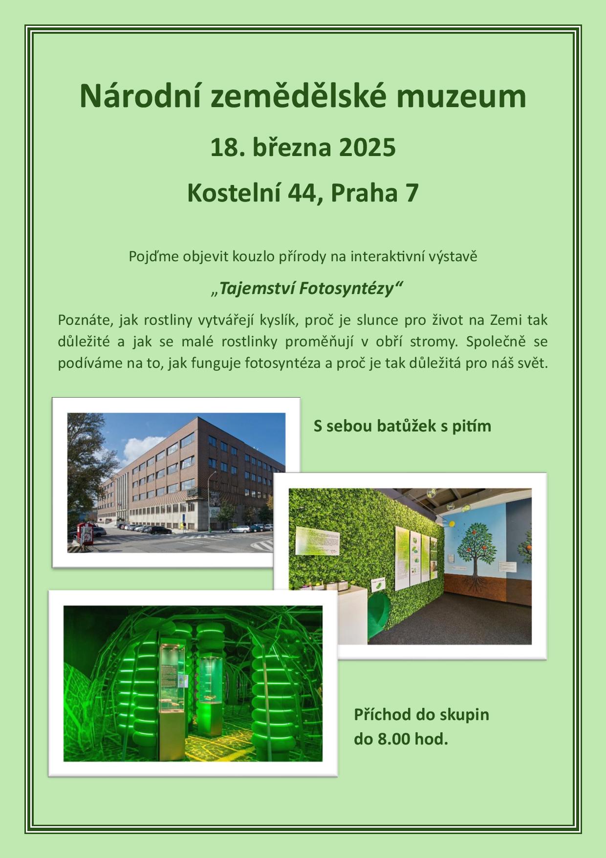 V úterý 18. března navštívily dětské skupiny Zemědělské muzeum v Praze 7, výstavu FOTOTSYNTÉZA. Výstava dětem zábavnou formou představila proces fotosyntézy. Velkoplošné instalace a interaktivní prvky výstavy zaujaly děti nejvíce. Jako bonus děti navštívily i výstavu traktorů, kde děti využily nabídku na jízdu na šlapadlech.