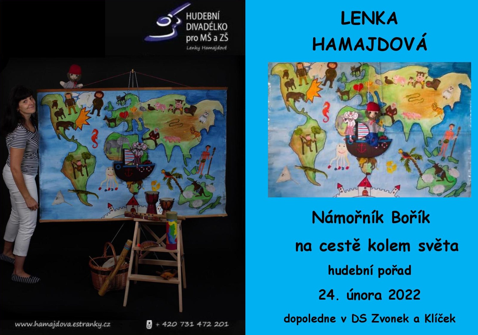 Ve čtvrtek dopoledne přiveze dětem Lenka Hamajdová námořníka Boříka a ten dětem ukáže celý svět. Společně se nalodí na velikou loď a budou obdivovat krásy a zajímavosti cizích krajů. Uvidí odlišnosti nejen u lidí, ale především u zvířátek. Nebudou chybět písně ani tanec a hra na hudební nástroje. Nejvíce se budeme těšit na tanec a hudbu domorodých kmenů. Plakát ke stažení: zde