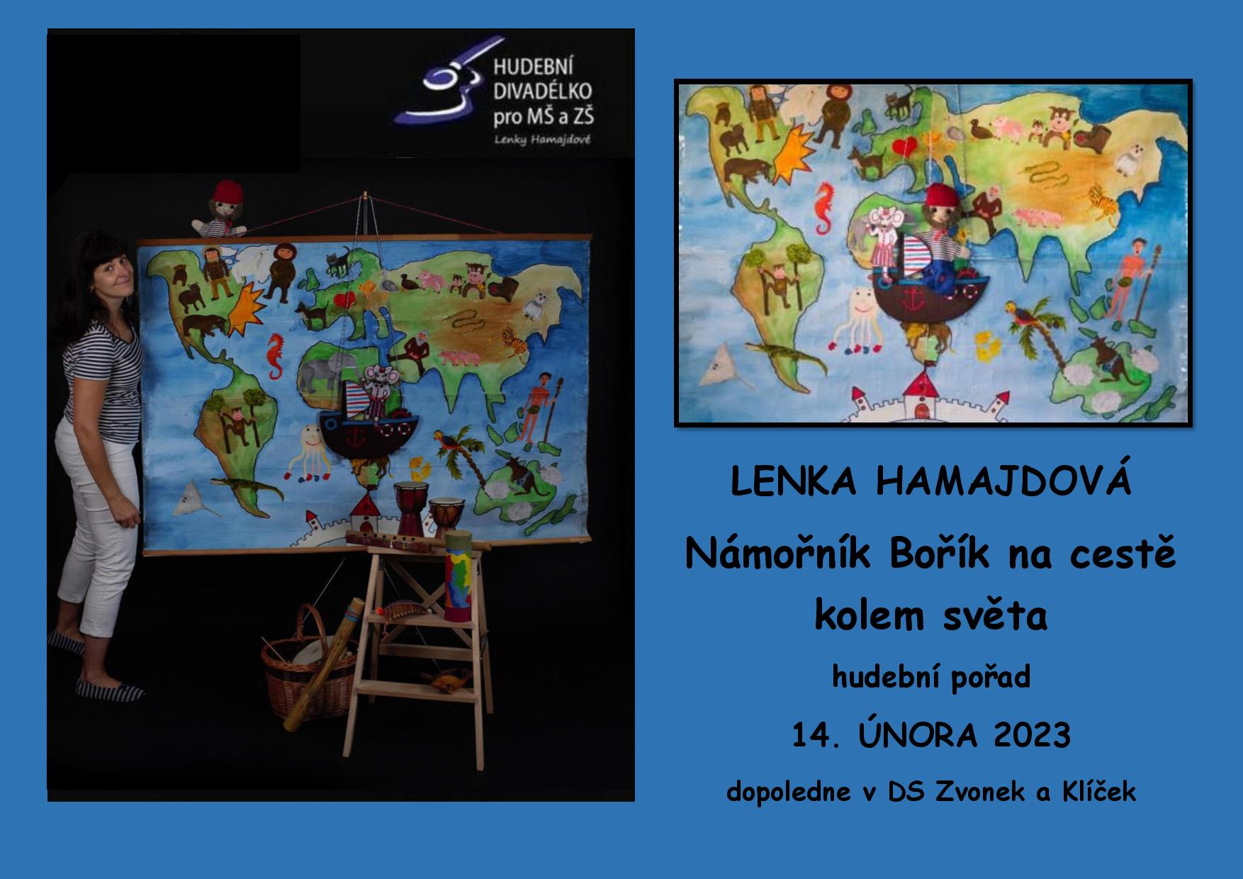 V úterý dopoledne přiveze dětem Lenka Hamajdová námořníka Boříka a ten nám ukáže celý svět. Společně se nalodíme na velikou loď a budeme obdivovat krásy a zajímavosti cizích krajů. Uvidíme odlišnosti nejen u lidí, ale také u zvířátek na různých kontinentech. Nebudou chybět písně, tanec a hra na hudební nástroje. Zajímavý jistě bude tanec a hudbu domorodých kmenů. Plakát ke stažení: zde