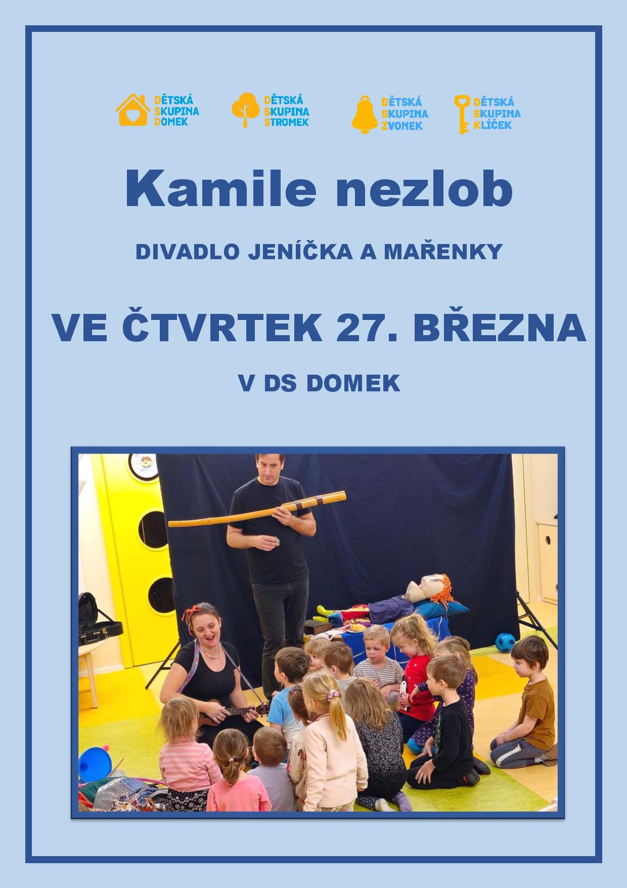 Ve čtvrtek 27. března přijelo Divadlo Jeníčka a Mařenky a přivezlo velmi poučný příběh „Kamile, nezlob.“ Už z názvu pochopíme, že byl o chlapci, který ale vůbec nevěděl, jak se má chovat. Proto byly naše děti požádány o pomoc naučit Kamila, co je správné. Děti mu do skleněných a kouzelných kuliček napovídaly kouzelná slovíčka. Kamilovi to moc pomohlo, jeho chování se zlepšilo a všem za to také krásně poděkoval.