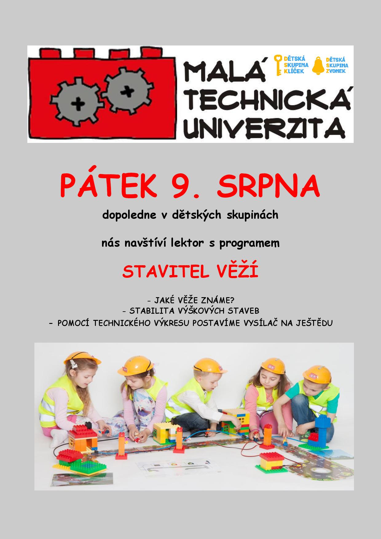 V pátek nás navštíví lektor z Malé technické univerzity, který nám odhalí pohled na stavbu věží po technické stránce. Nebude chybět skutečná stavba malých techniků. Program proběhne v dopoledním bloku. Plakát ke stažení: zde