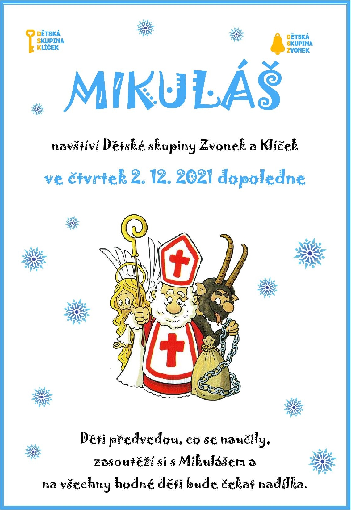 Ve čtvrtek 2. prosince navštíví děti v dětských skupinách Mikuláš s andílkem. Jistě přinesou i bohatou nadílku, protože ve skupinkách máme jen hodné děti. Děti Mikuláše a andílka překvapí vystoupením, písničkou i říkankou. Program proběhne během dopoledního bloku. Plakát ke stažení: zde