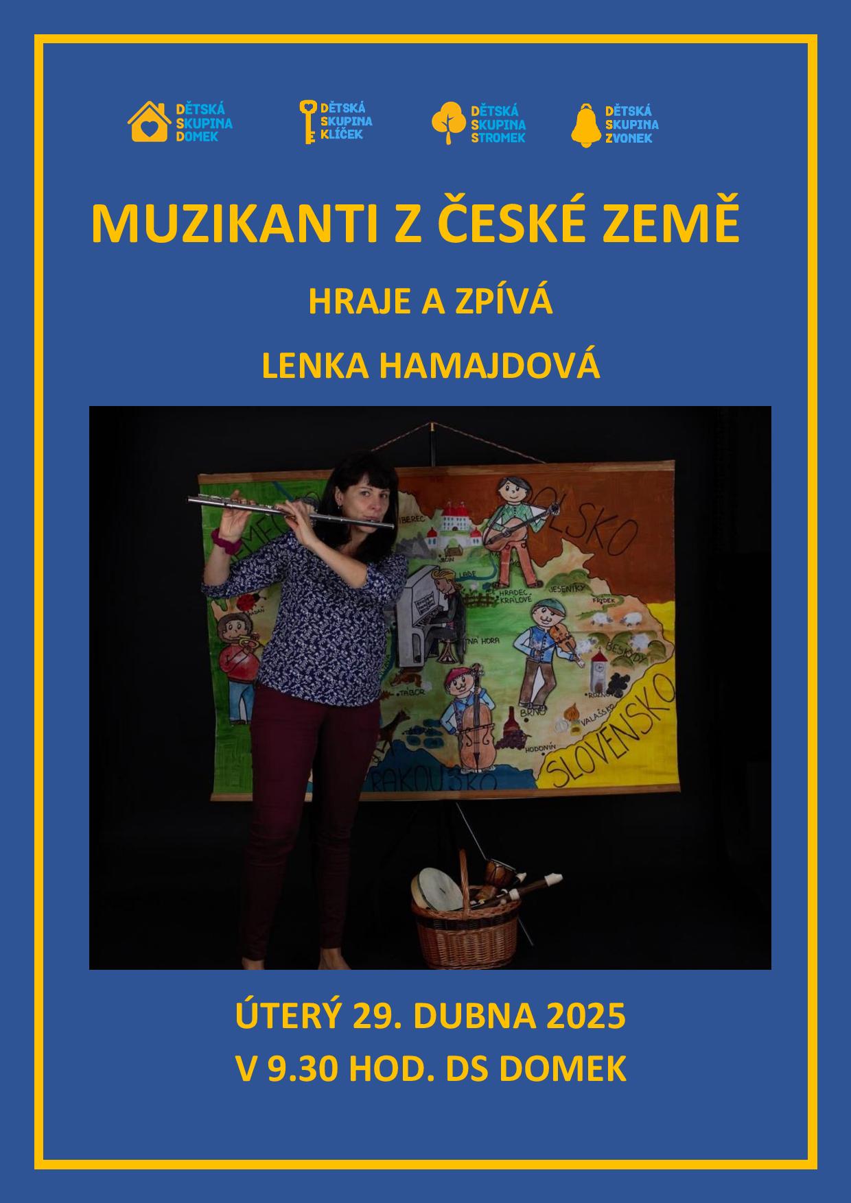 V úterý 29. dubna jsme si užili představení paní Hamajdové s názvem „Muzikanti z české země.“ Hned na začátku se nám představilo sedm muzikantů, které si ochotně zahrálo sedm dobrovolníků z řad našich dětí. Představil se nám například kytarista Kája, bubeník Béďa nebo Tonda, který hrál na trubku. Až se nakonec sešli všichni muzikanti a děti s nimi samozřejmě hrály a zpívaly také. Krásných písní byla opět celá hromada. Například „Ovčáci čtveráci,“ „Na Okoři cesta,“ nebo „Na to pražským mostě.“ A Dokonce jsme nějaké museli uhádnout.