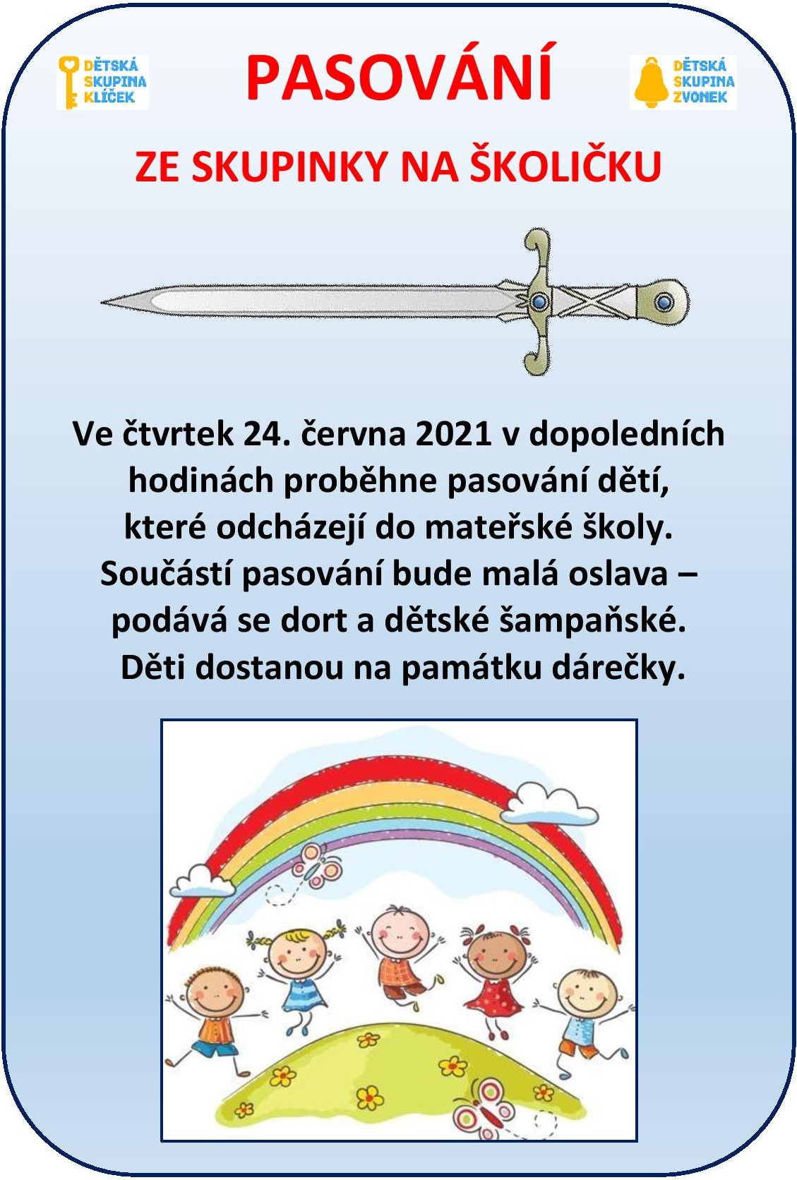 Během dopoledne se rozloučíme s dětmi, které z našich dětských skupin odcházejí do mateřských školek a někteří dokonce i do školy. Budou povýšeni do stavu "školčáků" a „školáků“. Pasování bude spojeno s velkou oslavou.