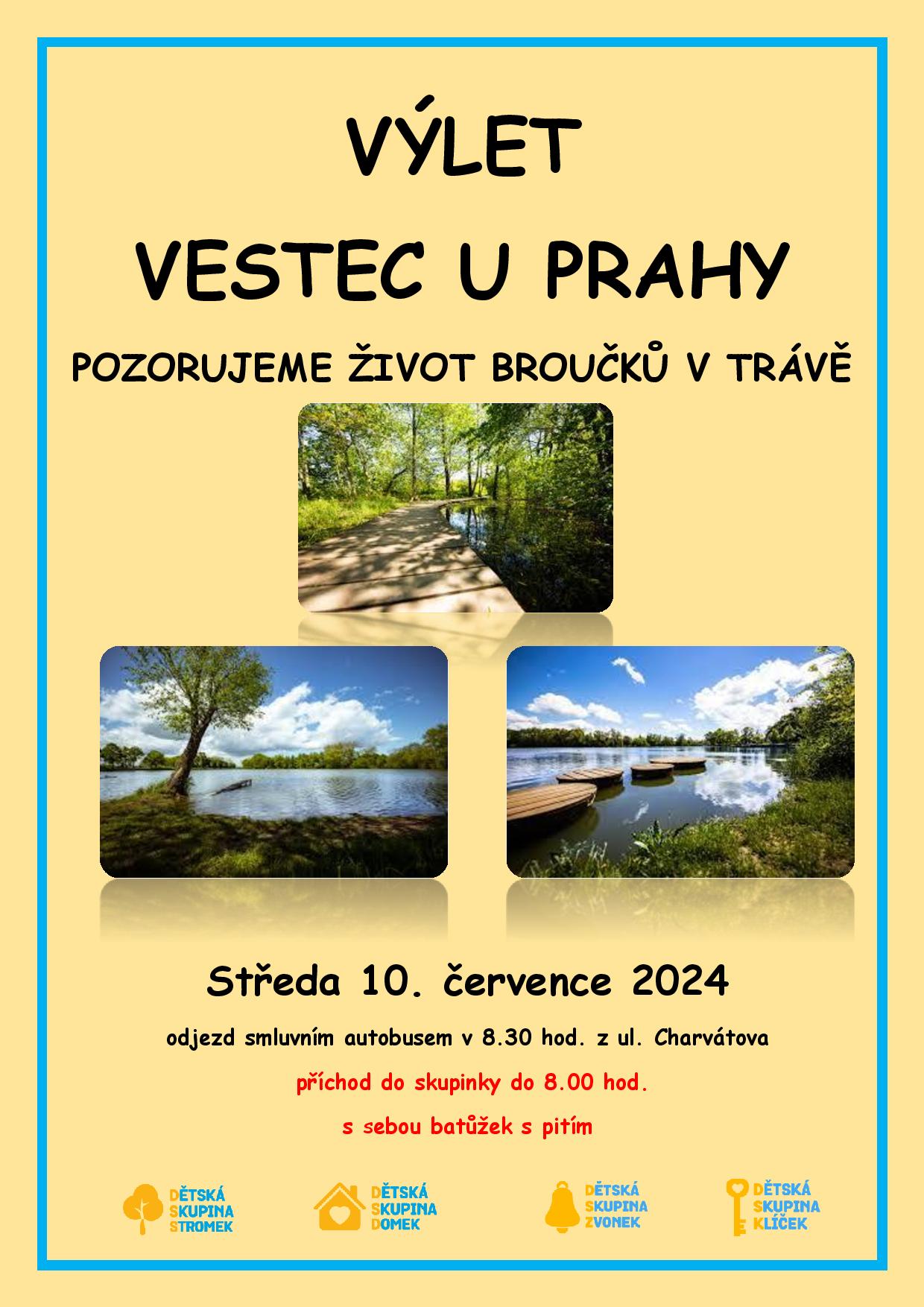 V doprovodu včelích medvídků se podíváme na život v trávě trochu blíže. Spojíme svačinu s poznáváním a zábavou. Všechny dětské skupiny vyrazí smluvním autobusem do přírodního rekreačního parku ve Vestci u Prahy. V zóně pro hraní najdou děti i klouzačku a trampolíny. Na oběd se jistě vrátíme zcela unavení. Příchod dětí do skupin do 8.00 hod. Odjezd v 8.30. Návrat na oběd do 11.30 hod. Na sebe sportovní oblečení dle aktuálního počasí.