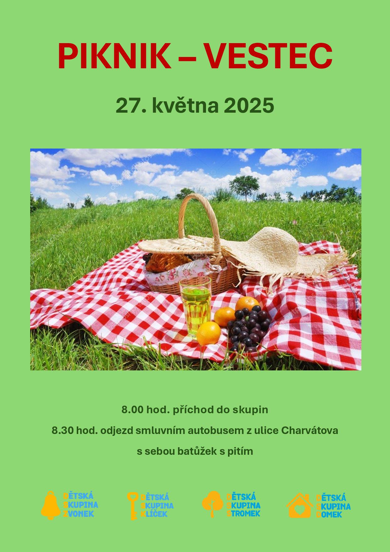 V úterý 27. května jsme s dětmi zavítali do přírodního areálu ve Vestci. Na místě jsme si udělali svačinku formou pikniku a vyzkoušeli jsme pohodlí stanů, které jsme vzali s sebou. Nechyběl ani „oheň a tradiční opékání buřtů". Po občerstvení děti využily herní prvky jako klouzačku, trampolíny a další atrakce, které se v areálu nacházejí. Pobyt v přírodě je vždy velmi příjemným zpestřením a děti si plně užívají možnost zábavy na čerstvém vzduchu.