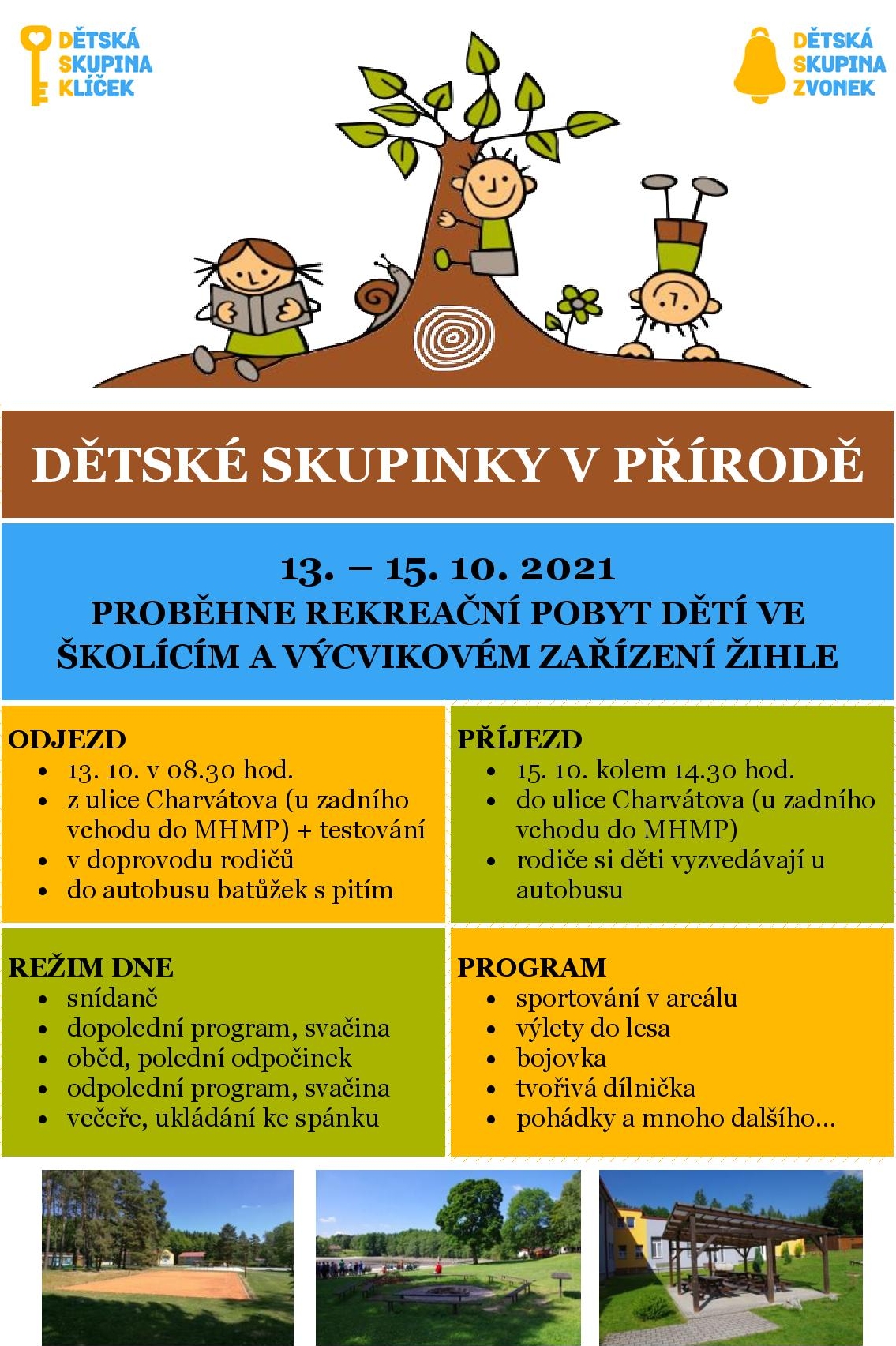 Děti ze skupinek odjíždí na třídenní rekreační pobyt v přírodě, v termínu od 13. - 15. května (středa až pátek). Pobyt (strava i ubytování) je opět zajištěn ve Školícím a výcvikovém zařízení Žihle, vše s finanční podporou z prostředků EU. Děti budou v okolních lesích sledovat podzimní změny přírody. Na všechno si doslova sáhnou a vyzkouší si, jak si hrát s dary lesa. Na děti opět čeká lesní bojová hra, sportování, tvorba i pohádky. V době pobytu dětí v Žihli jsou dětské skupiny Zvonek a Klíček v provoz, pouze kapacita míst je snížena na polovinu. Plakát ke stažení: zde