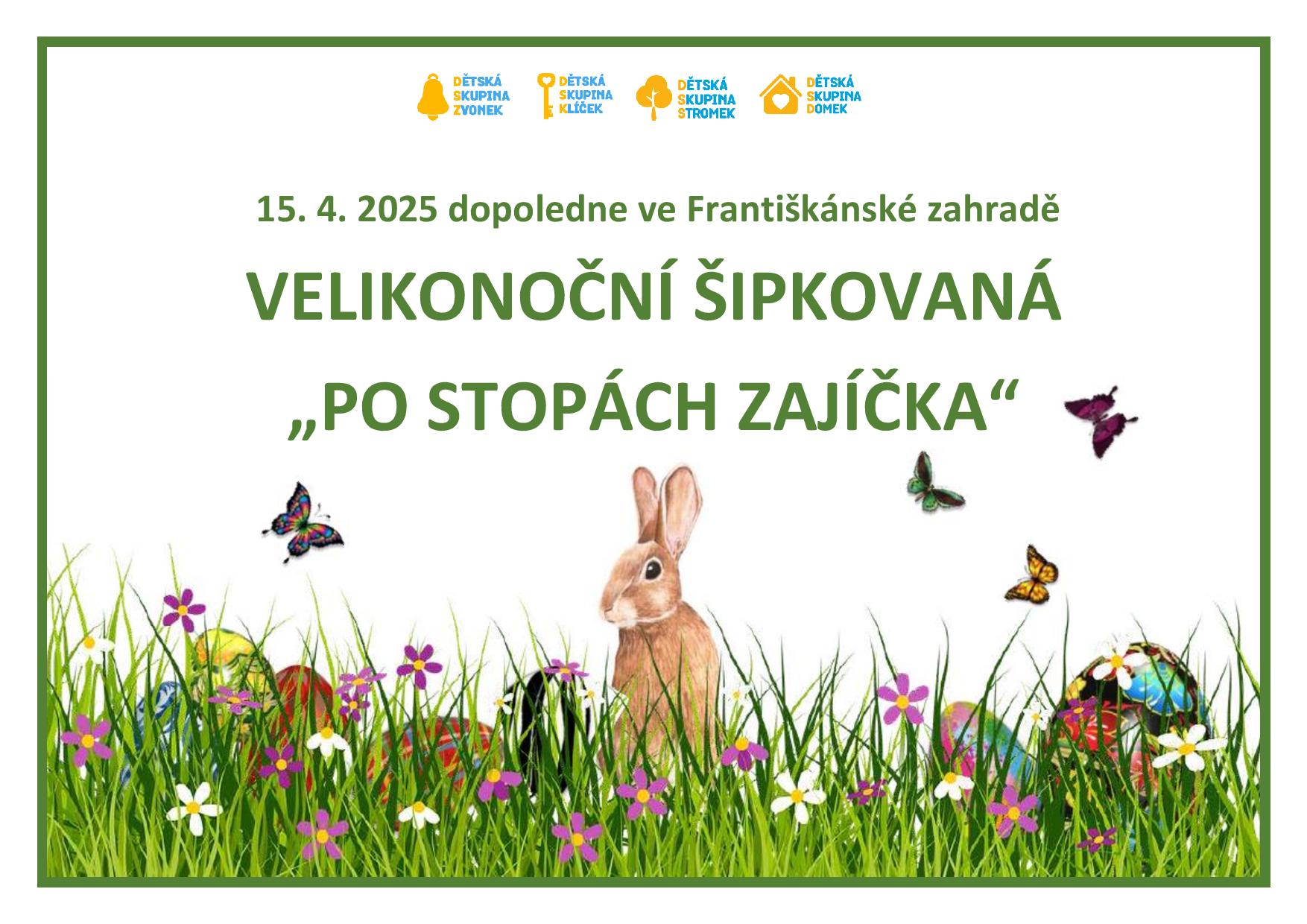 V úterý 15. dubna 2025 se děti vydaly po stopách Velikonočního zajíčka v okolí dětských skupin a ve Františkánské zahradě. Děti plnily různé logické i fyzické úkoly, za které sbíraly body. Na samém konci potkali Velikonočního zajíčka, u kterého body vyměnily za sladkou odměnu.