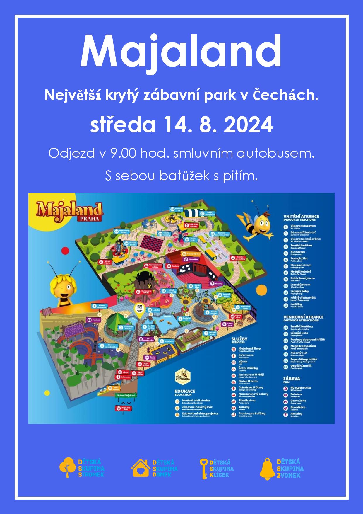 Ve středu 14. srpna prožijí děti z dětských skupin zábavu neskutečných rozměrů, kterou nabízí zábavní park Majaland v Tuchoměřicích. Odjíždíme v 9.00 hod. a děti budou s sebou potřebovat baťůžek s pitím a sportovní oblečení, aby to na žádné atrakci nevázlo. Vyzkoušíme si vodní fontánu, mega trampolínu, dopravní hřiště, dinosauří kolotoč, balonkové jezero, letecký strom i hřiště včelky Máji. Vracíme se ve 12.00 hod., abychom stihli oběd.