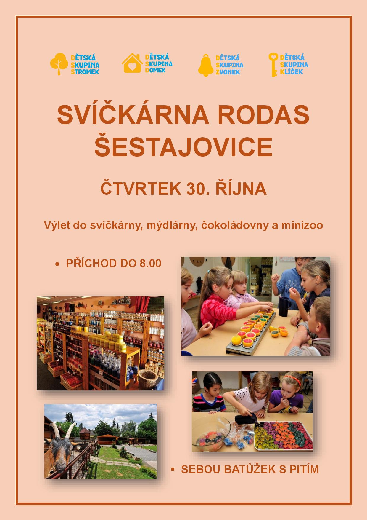 Čtvrtek 30. října 2025 se nesl v duchu voňavého tvoření mýdel a výroby dekorativních svíček ve firmě Rodas v Šestajovicích. V malebném prostředí si děti vyzkoušely barvení svíček ve voskové lázni a vykrajování mýdel různých tvarů. Venkovní zookoutek vybízel k procházce mezi různými druhy domácích zvířat. Počasí bylo na jedničku a dětem i tetám se výlet s poutavou tématikou moc líbil.