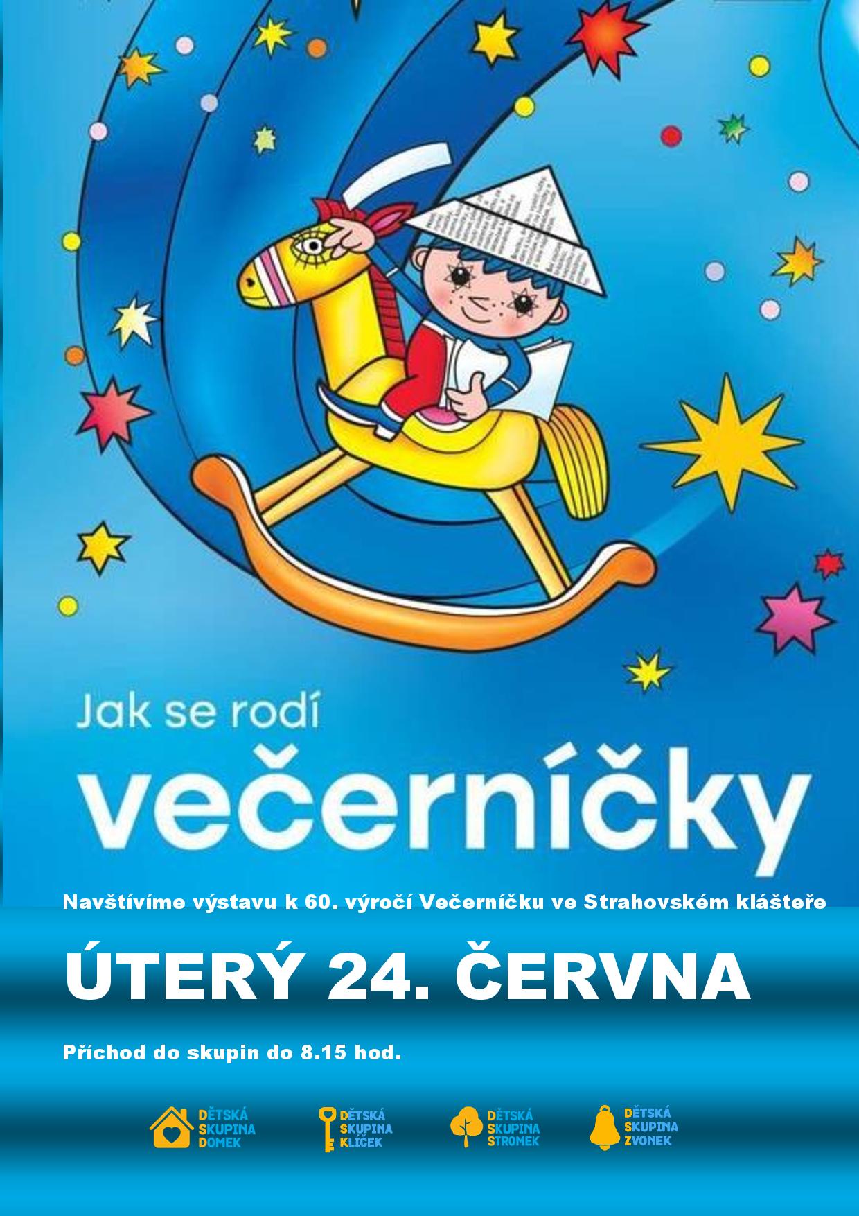 V úterý 24. června děti navštívily výstavu Večerníčků a ocitly se uprostřed pohádkového světa. Potkaly známé pohádkové postavičky z televizních pohádek, (od Rumcajse a Manky, Rákosníčka přes Křemílka a Vochomůrku až po Maxipsa Fíka či vílu Amálku). Děti viděly kulisy i rekvizity, které znají z večerníčkových pohádek. Dozvěděly se, jak se Večerníček připravuje, a měly možnost si některé věci na výstavě i vyzkoušet.