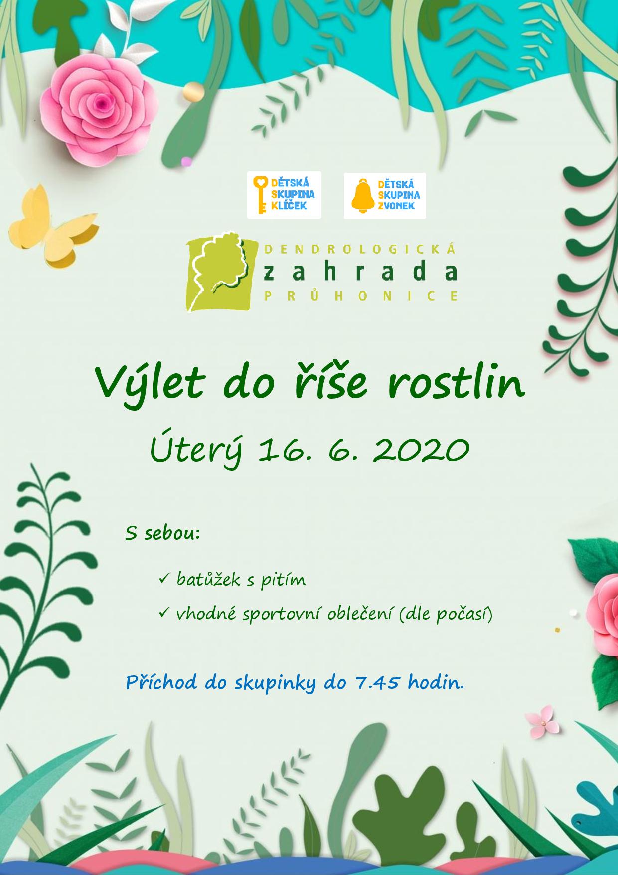 Děti odjíždí na dopolední výlet do Průhonic, kde se projdou v dendrologické zahradě, pozorovat budou květiny, ale i přítomný hmyz, ryby a ptactvo. Výlet ukončíme dováděním na místním dětském hřišti. S sebou baťůžek s pitím a náhradní rouškou. Oblečení dle aktuálního počasí. Příchod do skupin v 7. 45 hod., odjíždíme smluvním autobusem, návrat na oběd. Plakát ke stažení: zde