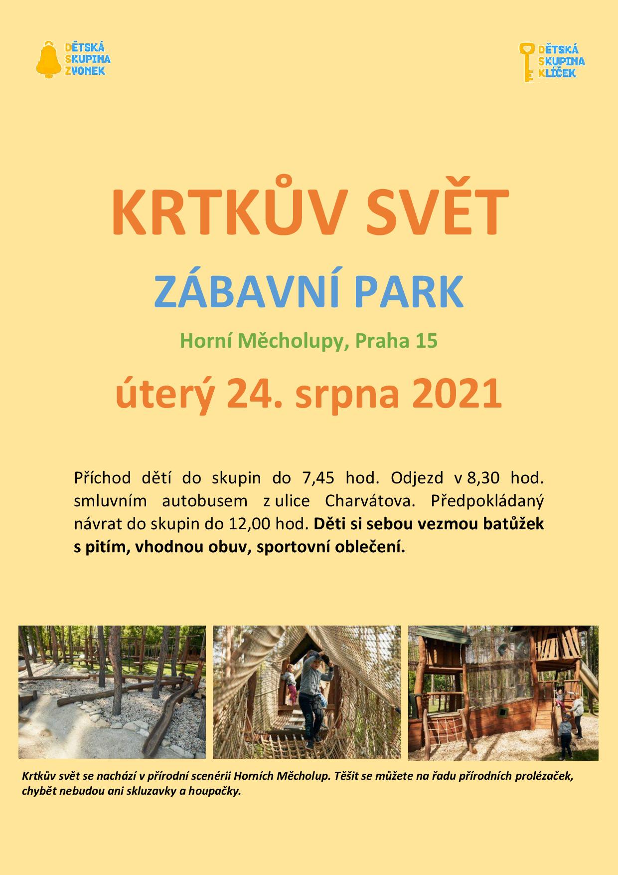 Děti navštíví zábavní park „Krtkův svět“ v Horních Měcholupech, kam se pojede na celé dopoledne smluvním autobusem. Čekají nás zážitky na čerstvém vzduchu (klouzačky, trampolíny, vodní atrakce, zvířátka i prolézačky). Sraz dětí ve skupinách je již v 7.45 hodin. Děti odjíždějí po svačince v 8.30 hodin. S sebou baťůžek s pitím a vhodné oblečení na zábavu a sportování dle aktuálního počasí. Vracíme se na oběd.