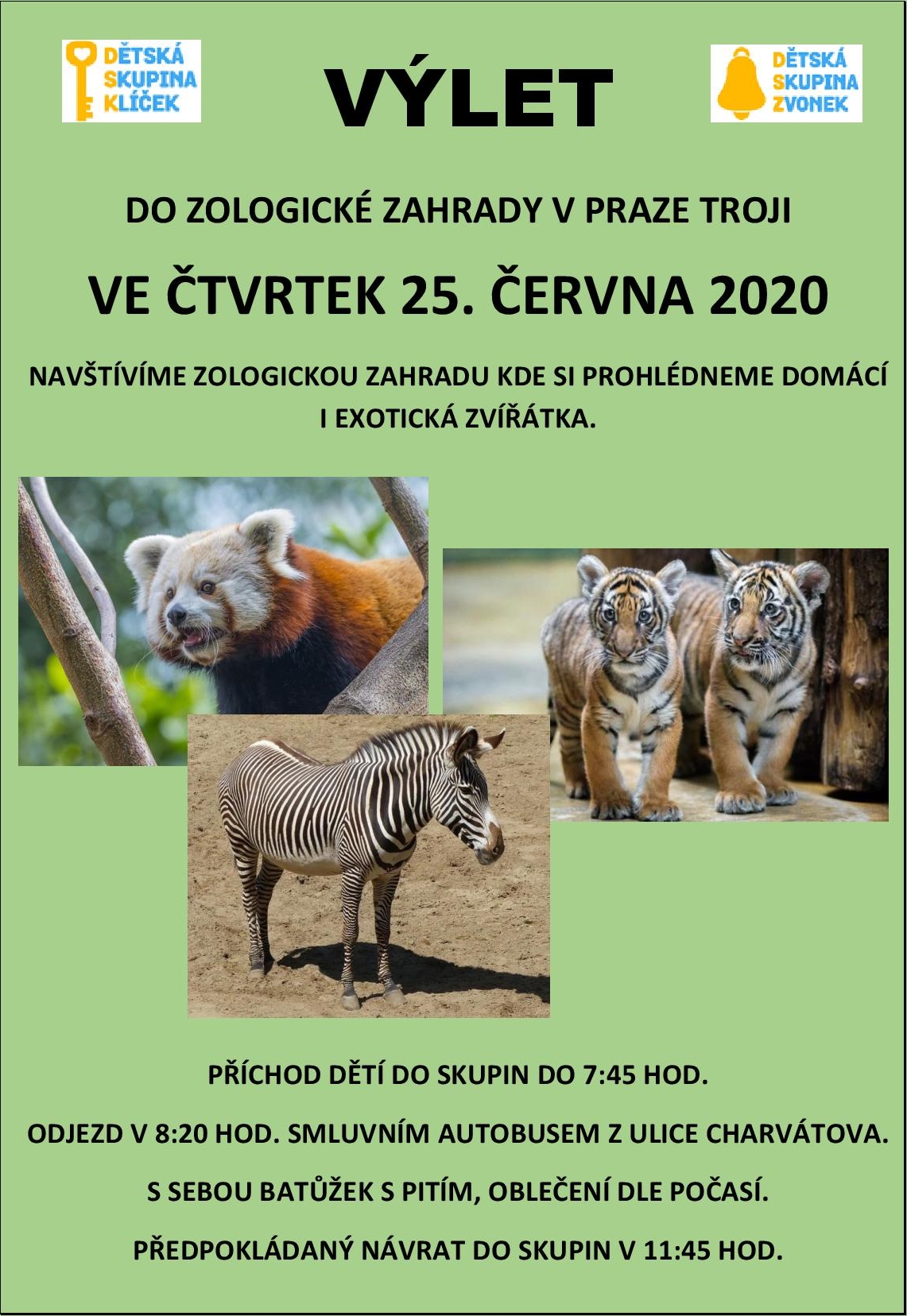 Děti odjíždí na dopolední výlet do Pražské ZOO v Troji. Projdeme část spodního areálu ZOO a výlet ukončíme na dětských atrakcích. S sebou baťůžek s pitím a náhradní rouškou. Oblečení dle aktuálního počasí. Příchod do skupin v 7.45 hod., odjíždíme smluvním autobusem. Návrat na oběd. Plakát ke stažení: zde