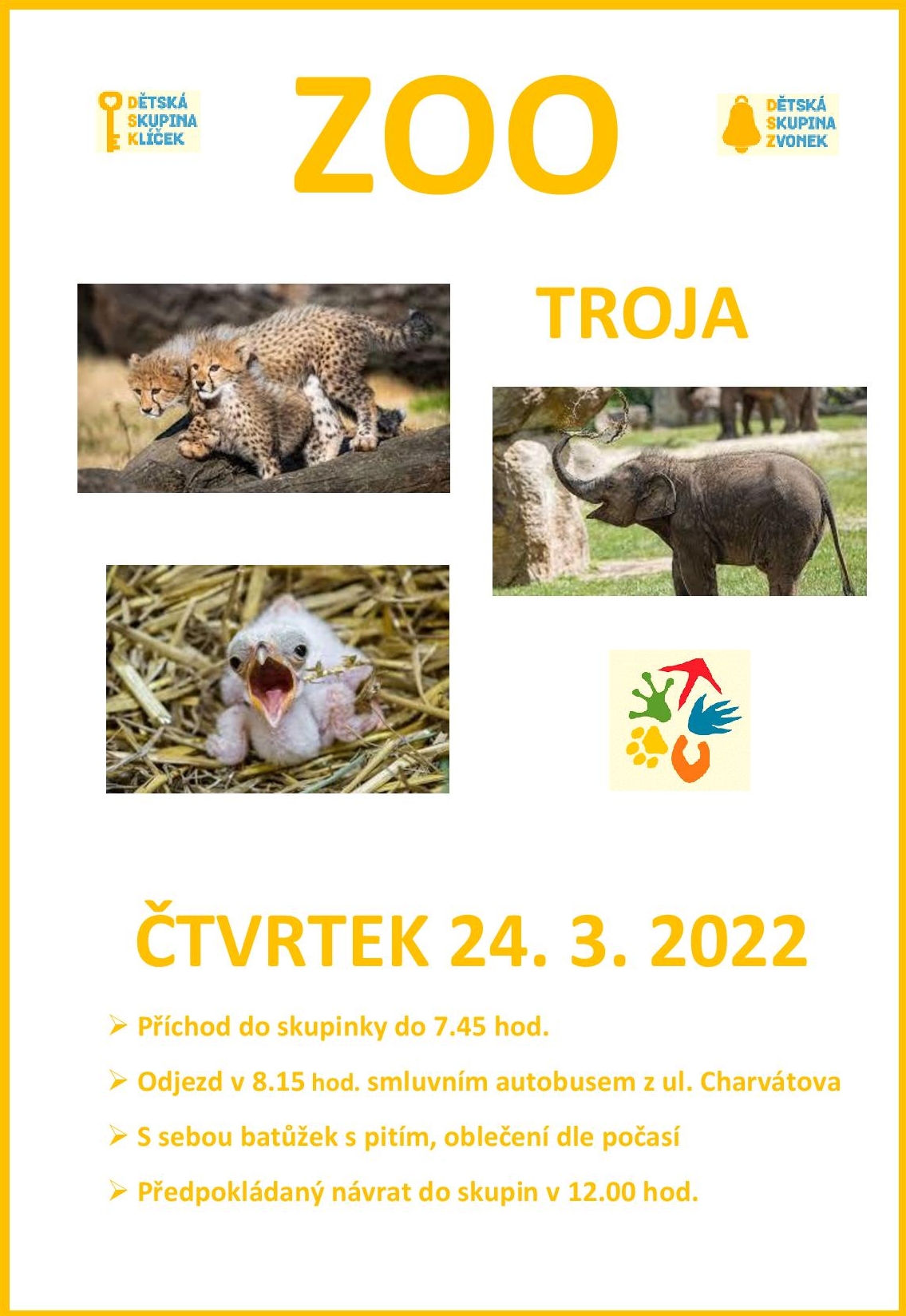 Všichni vyrazíme smluvním autobusem v 8.15 hod. do pražské ZOO v Troji za zvířátky. Do skupinek je nezbytné dorazit do 7.45. hod. Svačinku si dáme pod širým nebem, a pak budeme obdivovat rozmanitost přírody, která dokázala vymyslet tolik prapodivných a barevných živých tvorů. Určitě bude čas i trochu si pohrát na čerstvém vzduchu. Dětem dejte baťůžek s pitím v lahvičce. Předpokládáme, že si to pořádně užijeme a na oběd dorazíme později, návrat do 12.00 hod. Plakát ke stažení: zde