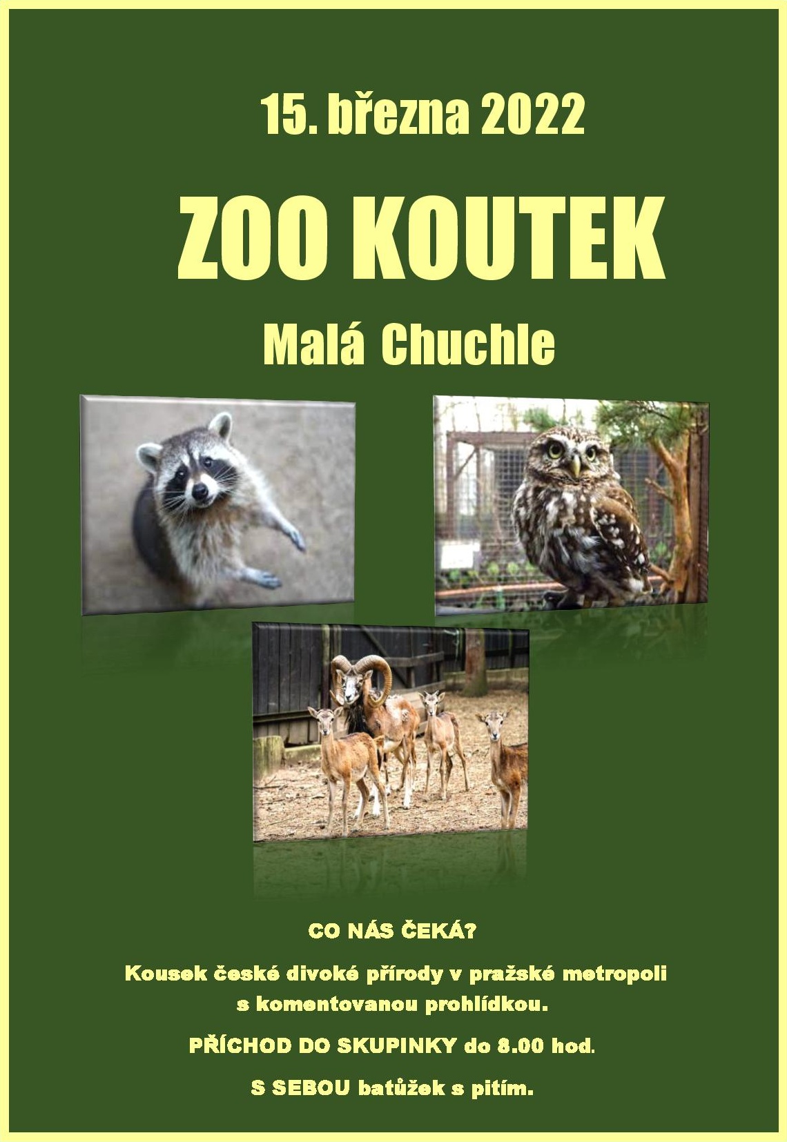 S dětmi pojedeme v úterý 15. března smluvním autobusem do ZOOkoutku Malá Chuchle, kde strávíme dopoledne v přírodě plné zvířátek a zajímavých přírodnin. Pracovníci Lesů hl. m. Prahy dětem zajistí komentovanou prohlídku spojenou s krmením zvířátek. Nebude chybět poznávačka, soutěže a také zábava. S sebou dejte dětem baťůžek s vlastním pitím v lahvičce. Příchod do skupinek do 8.00 hodin, vracíme se na oběd. Plakát ke stažení: zde