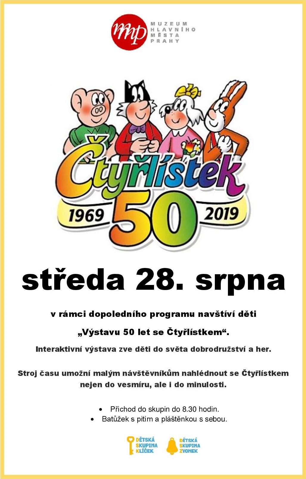 V Muzeu hlavního města Prahy se děti rozloučí s letošními letními prázdninami. Uzavřou tak cestu časem a ještě jednou se s Čtyřlístkem, díky stroji času, podívají do minulosti. Příchod do skupin do 8.30 hodin. Dětem dejte baťůžek s pitím a pláštěnkou. Plakát ke stažení: zde