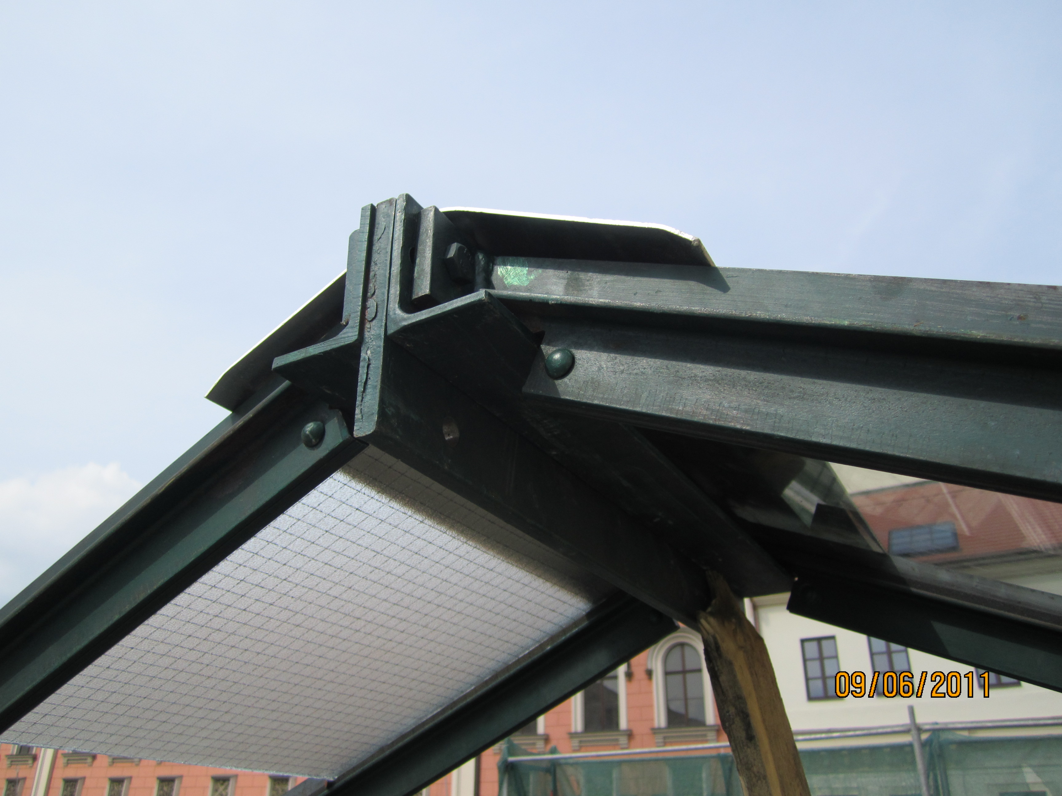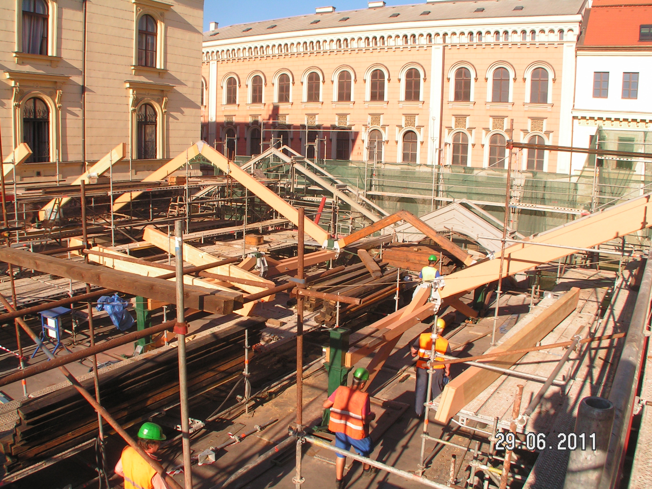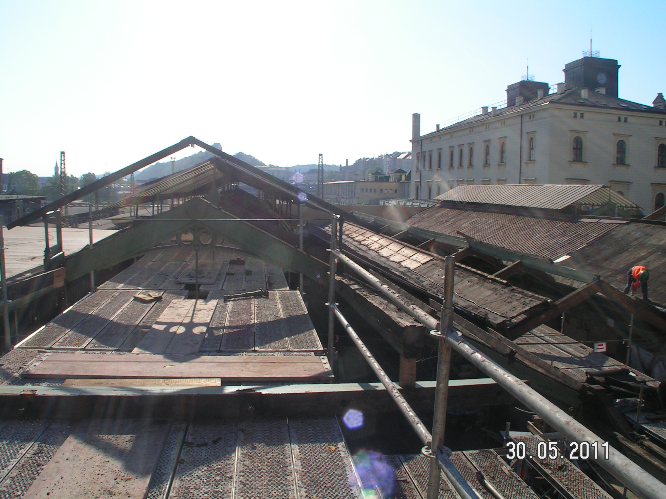 - oprava světlíků (ponechány původní sloupky, vazničky a krokvičky nové v profilaci odvozené od stávající vyskládané z úhelníků a pásoviny, zasklení bezpečnostním sklem s vloženým drátěným prvkem),