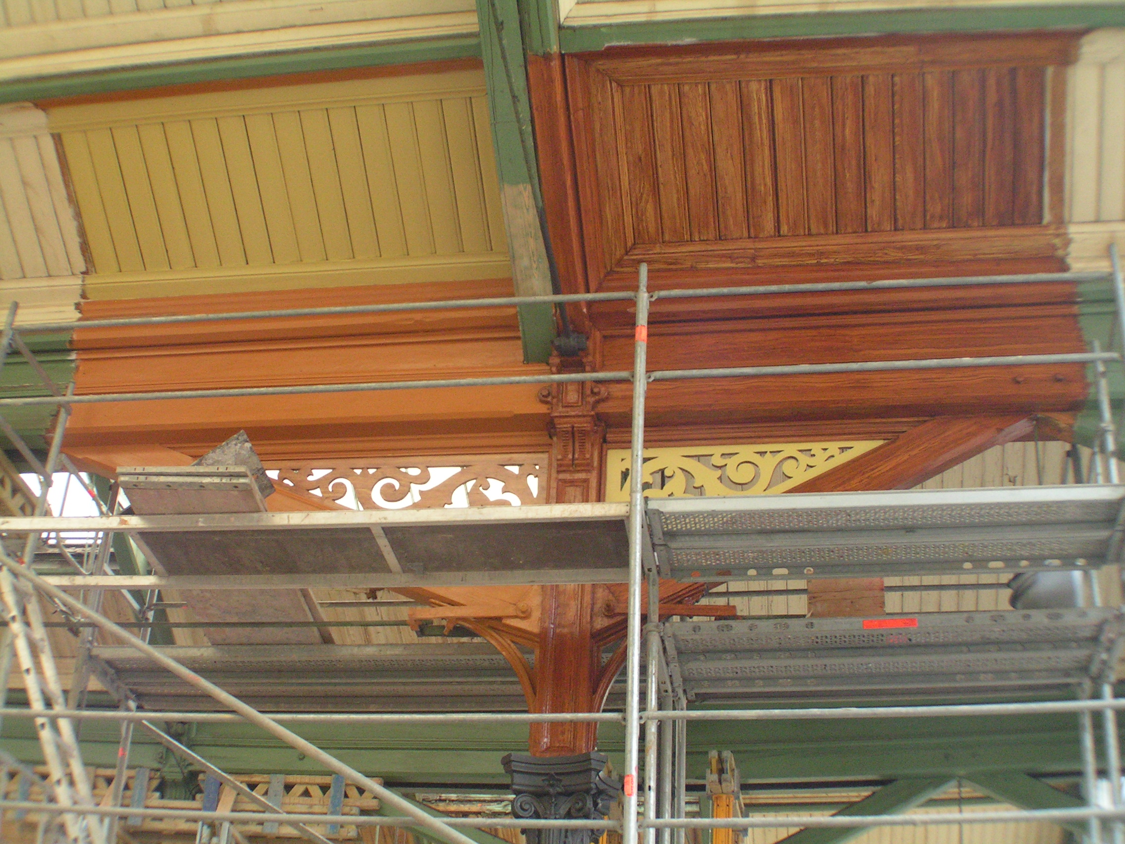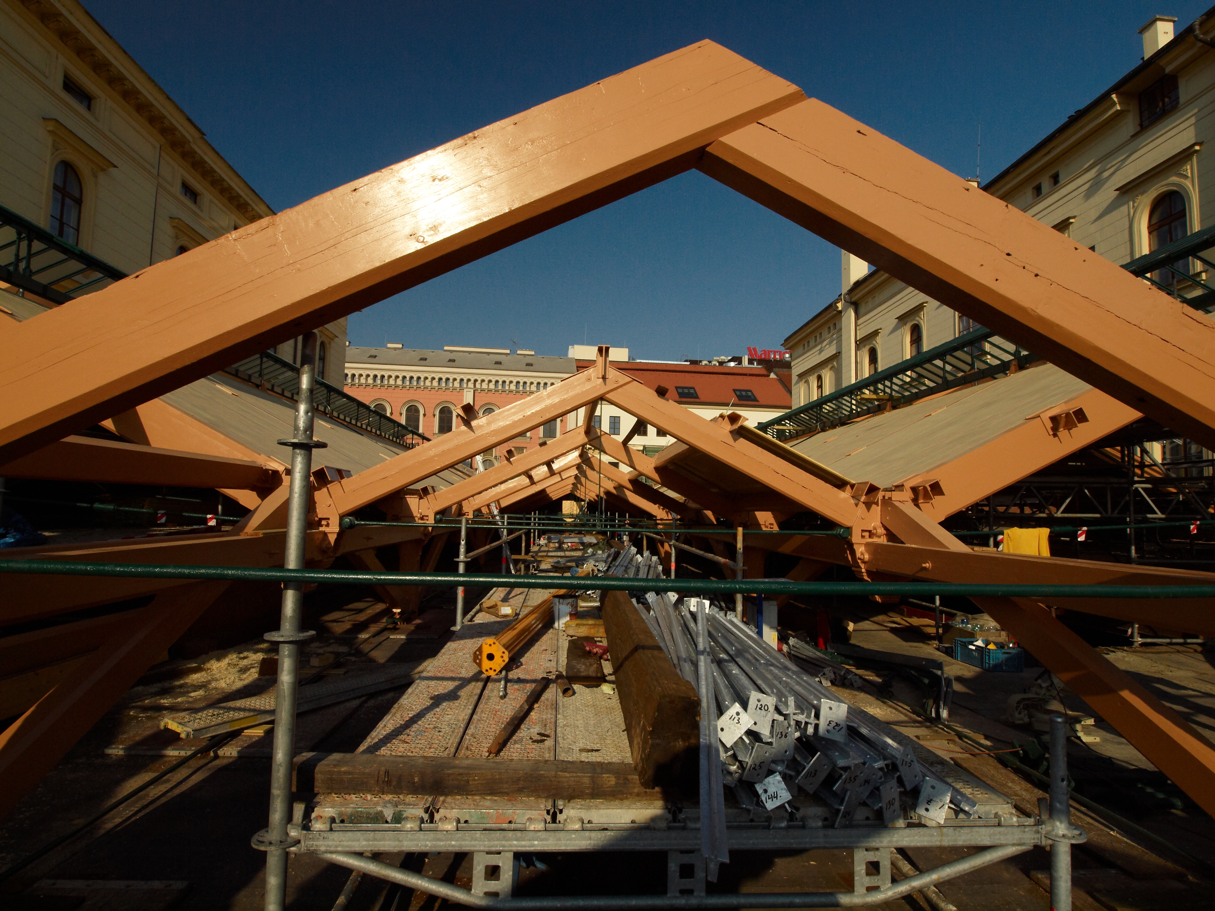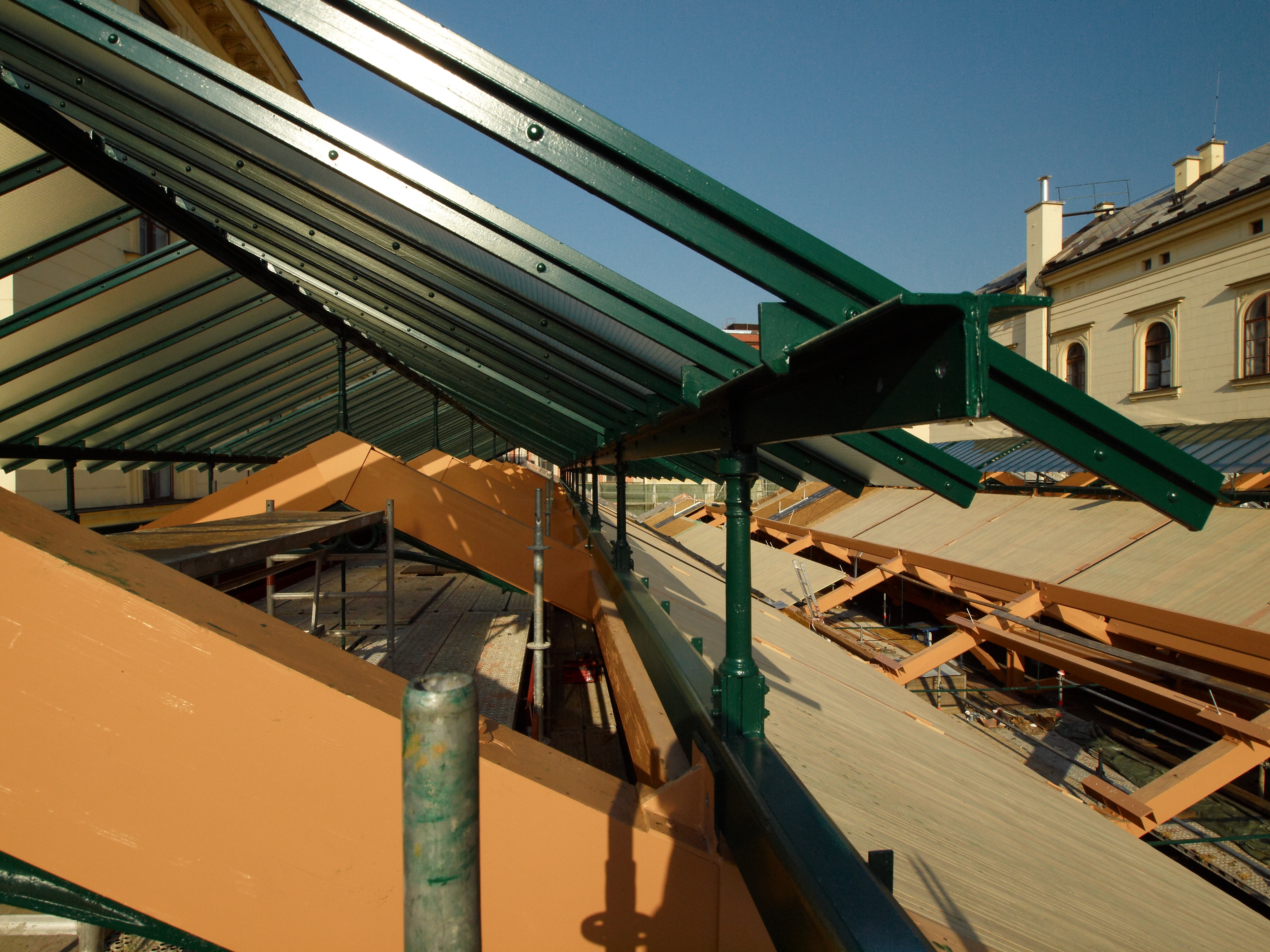 - posílení jednotlivých konstrukčních prvků a spojů (zachování stávajících dřevěných krokví ve středním poli, náhrada krokví bočních polí novými dřevěnými prvky opracovanými jako stávající, ponechání stávajících kovových botek pro uložení vazníků ve zdech, viditelné botky odlity nové, provedení nových betonových základových patek pod sloupy, podchycení sloupů mikropilotami, na základě zkoušek v Kloknerově ústavu ponechána většina stávajících litinových sloupů, náhrada tří sloupů poškozených trhlinami kopií sloupů původních, nové odlité hlavice sloupů podle jednoho nalezeného vzorku, vložení plastové trubky pro odvod vody do litinových sloupů a napojení na kanalizaci,),