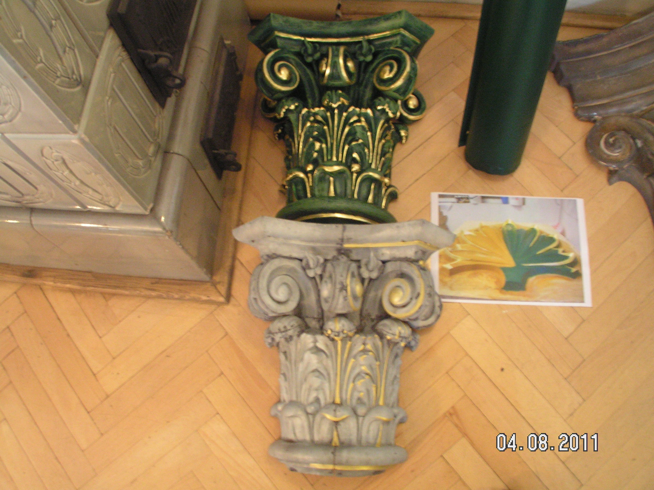 - povrchová úprava prvků (odstranění nátěrů z kovových prvků pískováním, z dřevěných mechanicky s následným přebroušením, úprava dřevěných prvků fládrem v odstínu světlého dubu, nátěr kovových prvků zelenou barvou v odstínu RAL 6005, patinování a zlacení zdobných kovových prvků).