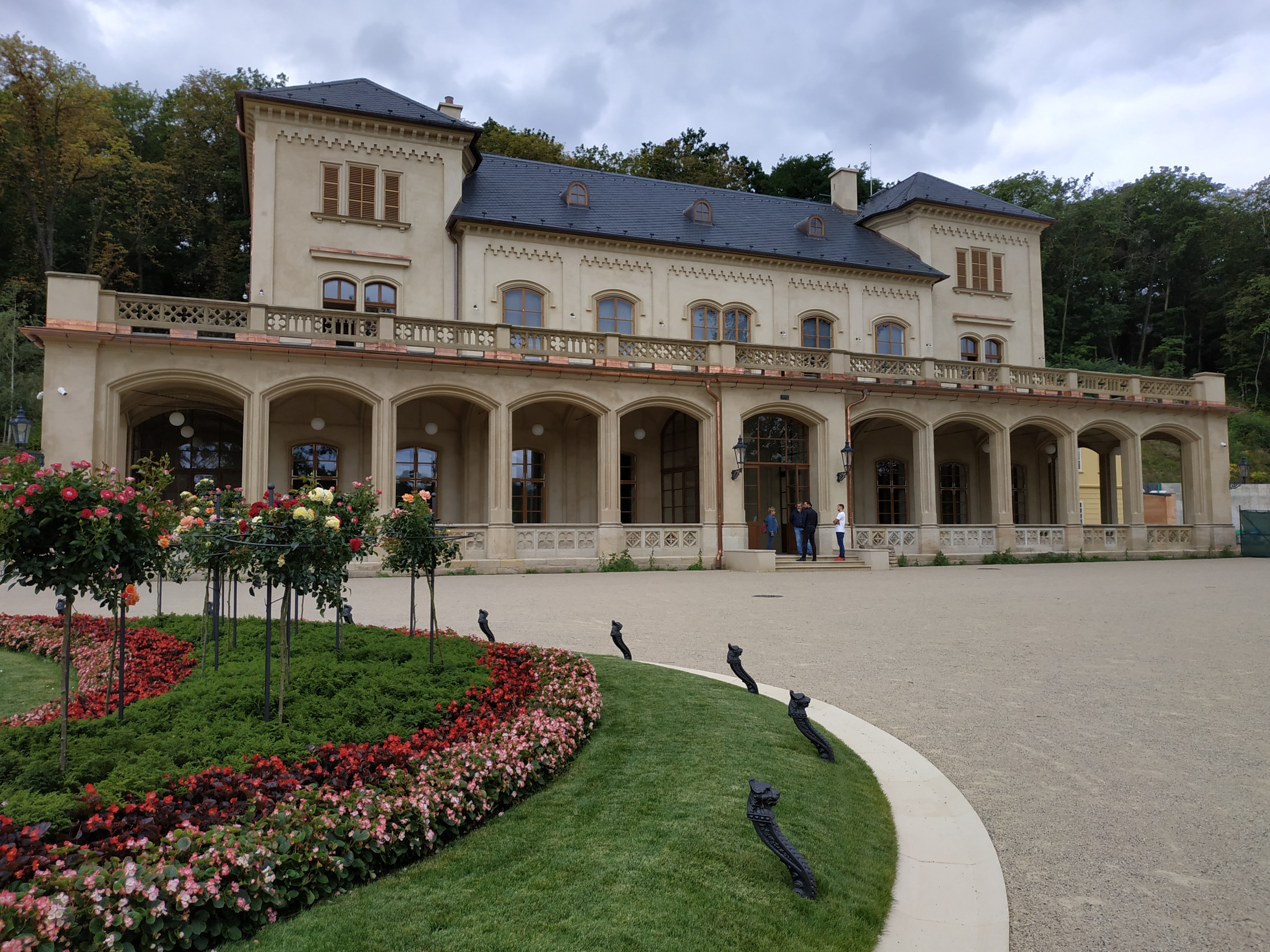 Bývalý lovecký zámeček, tzv. královská dvorana, byl postaven pod vedením Kryštofa Vratislava z Mitrovic v letech 1689–1691 pro císaře Leopolda I., kdy byl rovněž velký sál vyzdoben freskou Jana Jakuba Steinfelse ze Steinfelsu v bohaté štukové výzdobě s císařskými atributy. Při sále byla vybudována grotta, údajně s figurou Poseidona umístěnou na skále nad fontánou. Úprava objektu na restauraci byla provedena v roce 1791 podle návrhu architekta Františka Antonína Leonarda Hergeta. Výrazně novogotická přestavba od Bernarda Gruebera, při níž byla k objektu přistavěna přízemní veranda s horní terasou a boční sály zvýšeny jako dvoupatrové věže, pochází z roku 1855–57. Ve stejném období byla vedlejší klasicistní budova nastavěna o patro. V 19. století v souvislosti s otevřením obory veřejnosti roku 1804 zde od roku 1811 fungovala kavárna. Roku 1883 si budovu pronajal Václav Šlechta, v držení jeho rodiny zůstala restaurace až do poloviny 20. století.