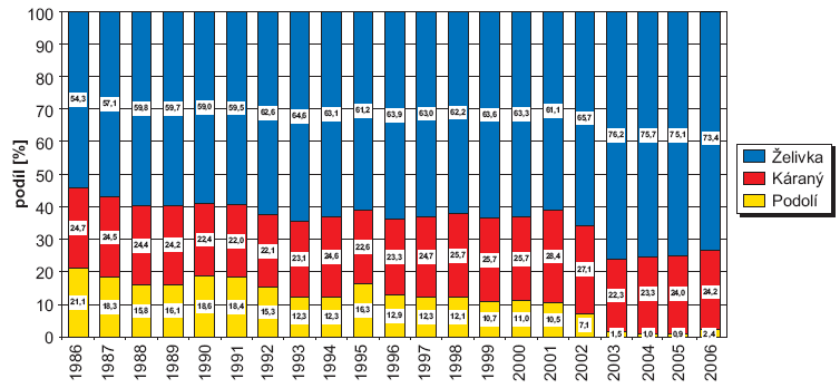 Procentuální podíl jednotlivých vodáren na celkové výrobě pitné vody od roku 1986 je znázorněn v obrázku. V zobrazeném časovém období došlo k největšímu poklesu podílu na celkové výrobě u vodárny Podolí. Zatímco v polovině 80. letech činil její podíl okolo 20 %, v roce 2006 pouze 2,4 %. V případě vodárny Káraný činil v roce 2006 podíl na celkové výrobě pitné vody 24,2 %, což přibližně odpovídá hodnotám z 2. poloviny 80. let. Úpravna vody Želivka dosáhla v roce 2006 podílu 73,2 %, tj. podstatně více, než v 80. a 90. letech.