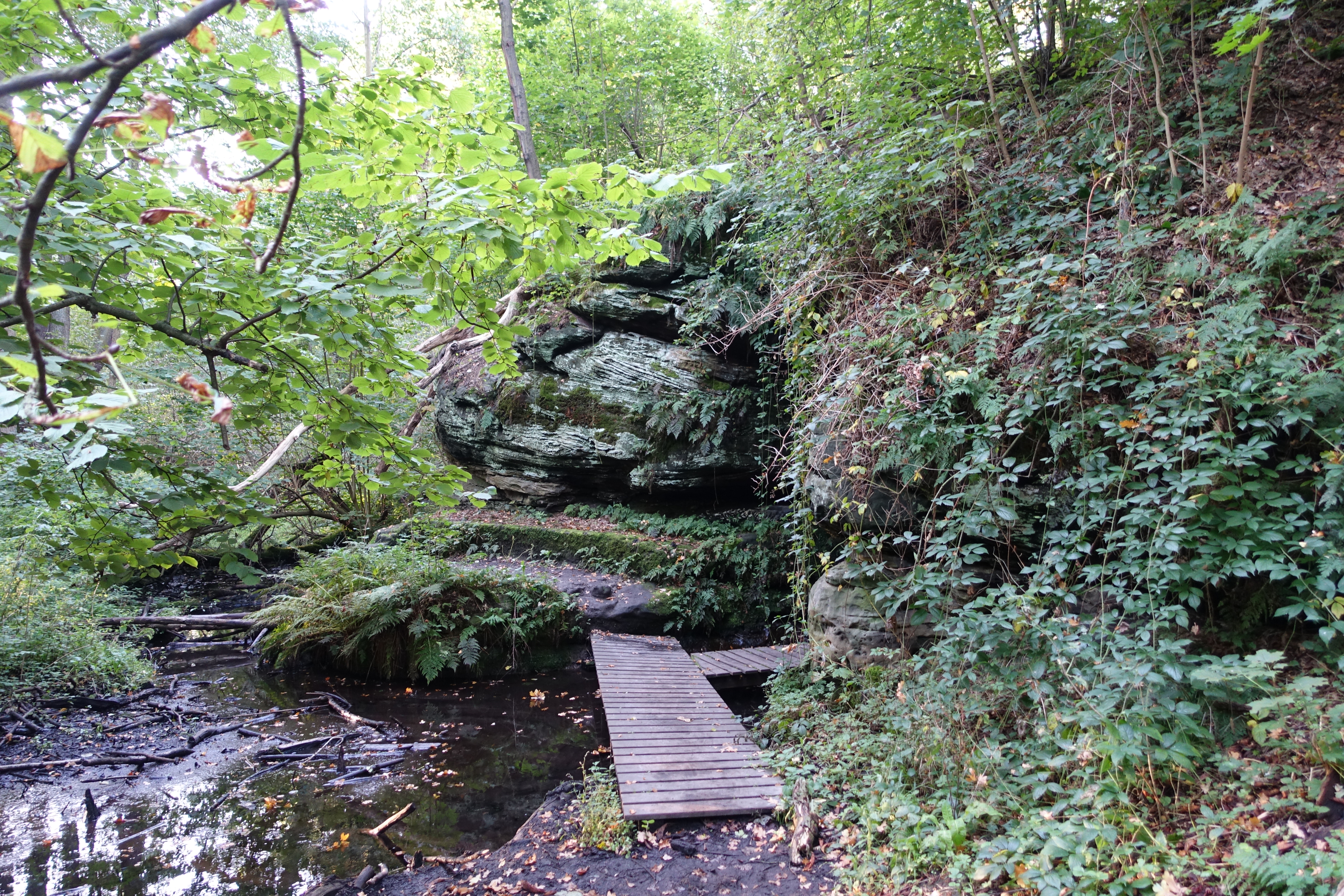 | 1 km | Odbočka (7) k památnému topolu (8) Ještě než vstoupíte do Vinořského parku můžete si udělat odbočku (cca 0,5 km navíc tam a zpět) k památnému topolu (8) nacházející se v polích mezi Satalicemi a Vinoří (mimo trasu). Na rozcestí odbočíte vlevo a směřujete k silnici spojující výše zmíněné městské části. Od silnice již vidíte v polích mohutný topol. Poté se opět vrátíte na rozcestí k červené turistické značce a vstoupíte do Vinořského parku. Procházíte mírně se svažující pěšinou, držíte se turistické značky. V ostré zatáčce míjíte studánku nazývanou V Oboře (také Pod hradištěm) (9). V okolí cesty začínají být nápadné pískovcové skály (10), místy porostlé břečťanem. |