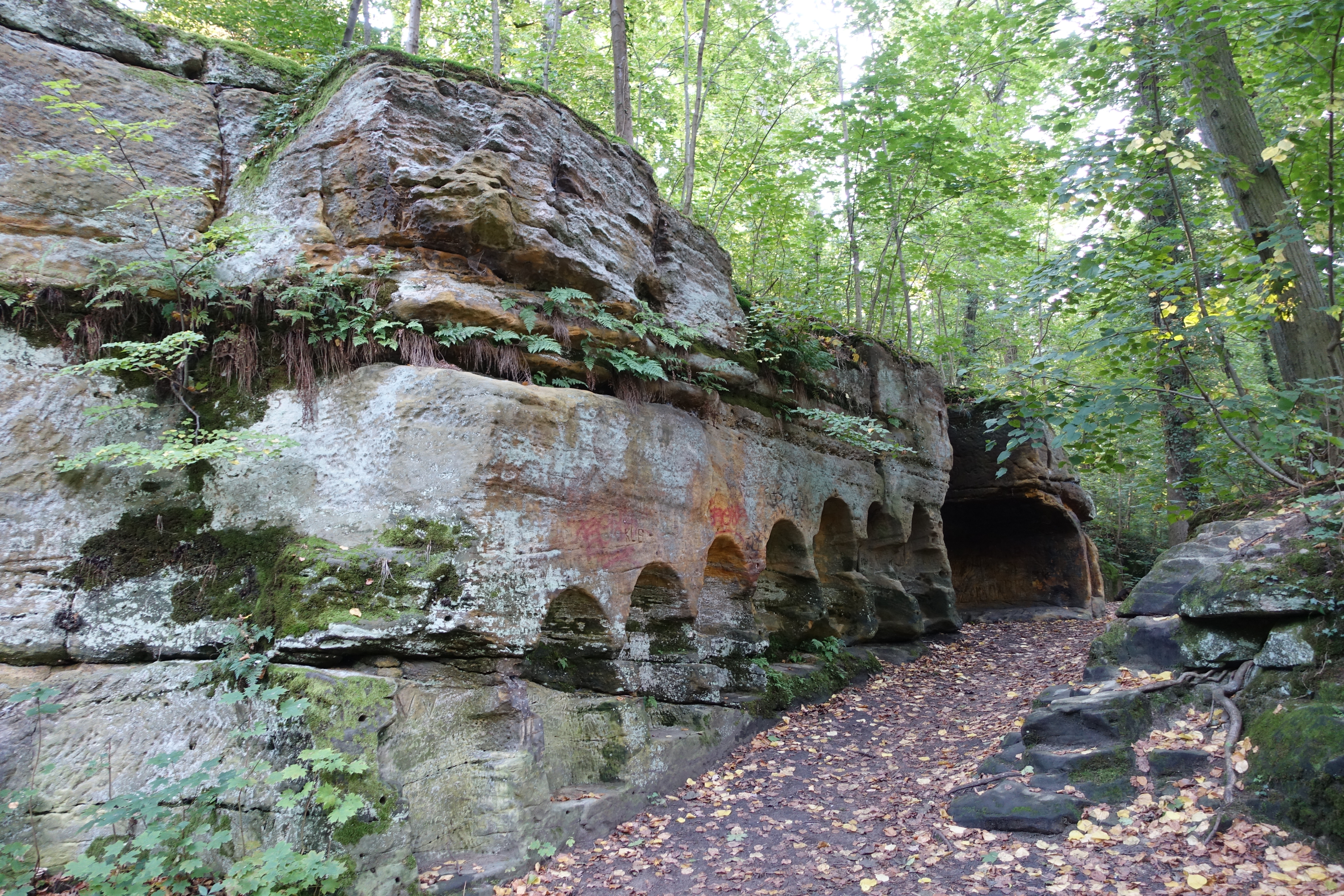 U Kamenného stolu (11) Přicházíte k rybníku s ostrůvkem u jehož hráze je torzo prastaré lípy a vpravo od ní jsou do skály vytesané výklenky. Pokračujete stejným směrem po značce a zanedlouho přicházíte do Vinoře. |