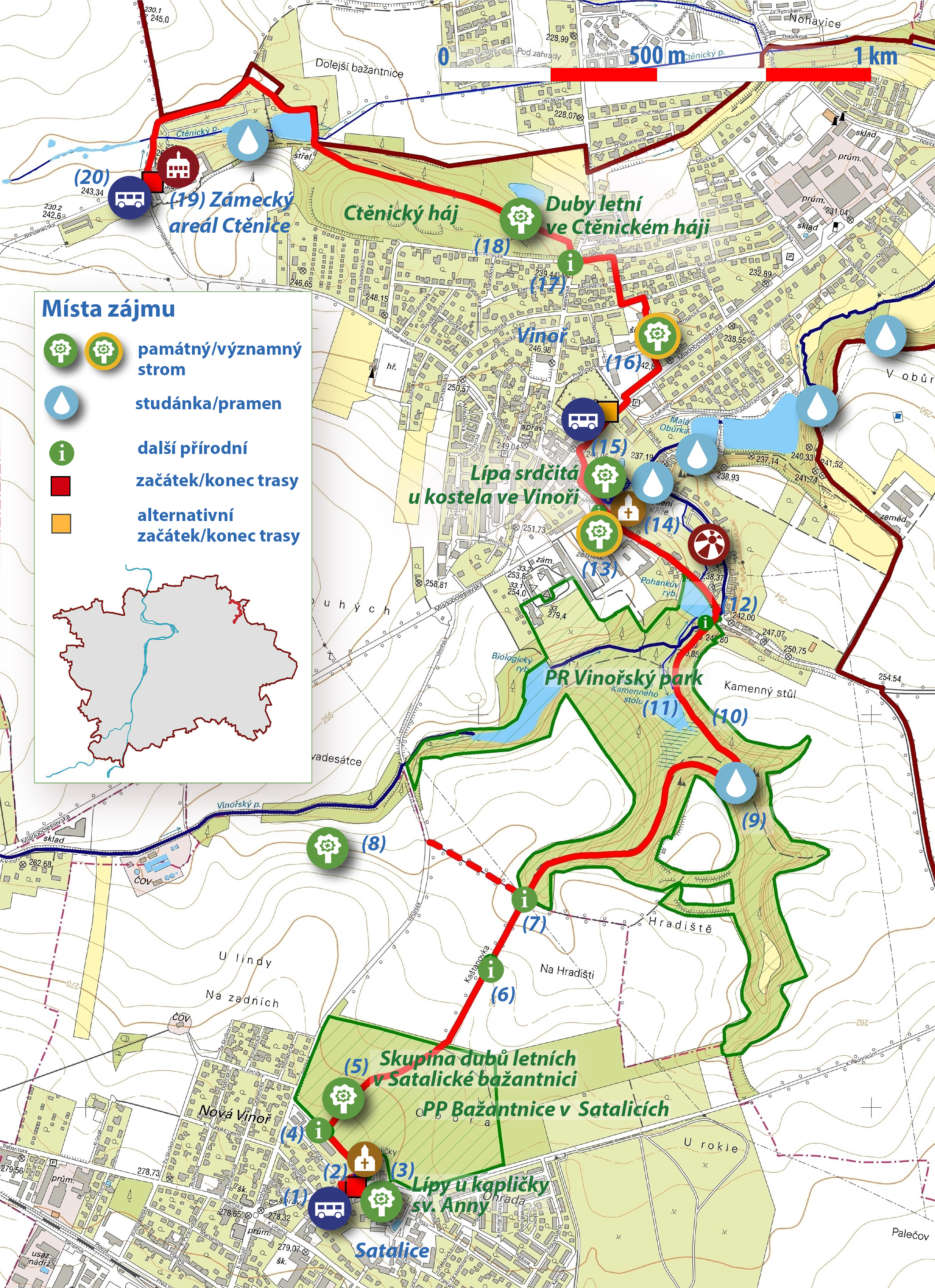 | 2,0 km (2,5 km při započtení odbočky k památnému topolu /uvedeno v závorce u všech následujících míst/)