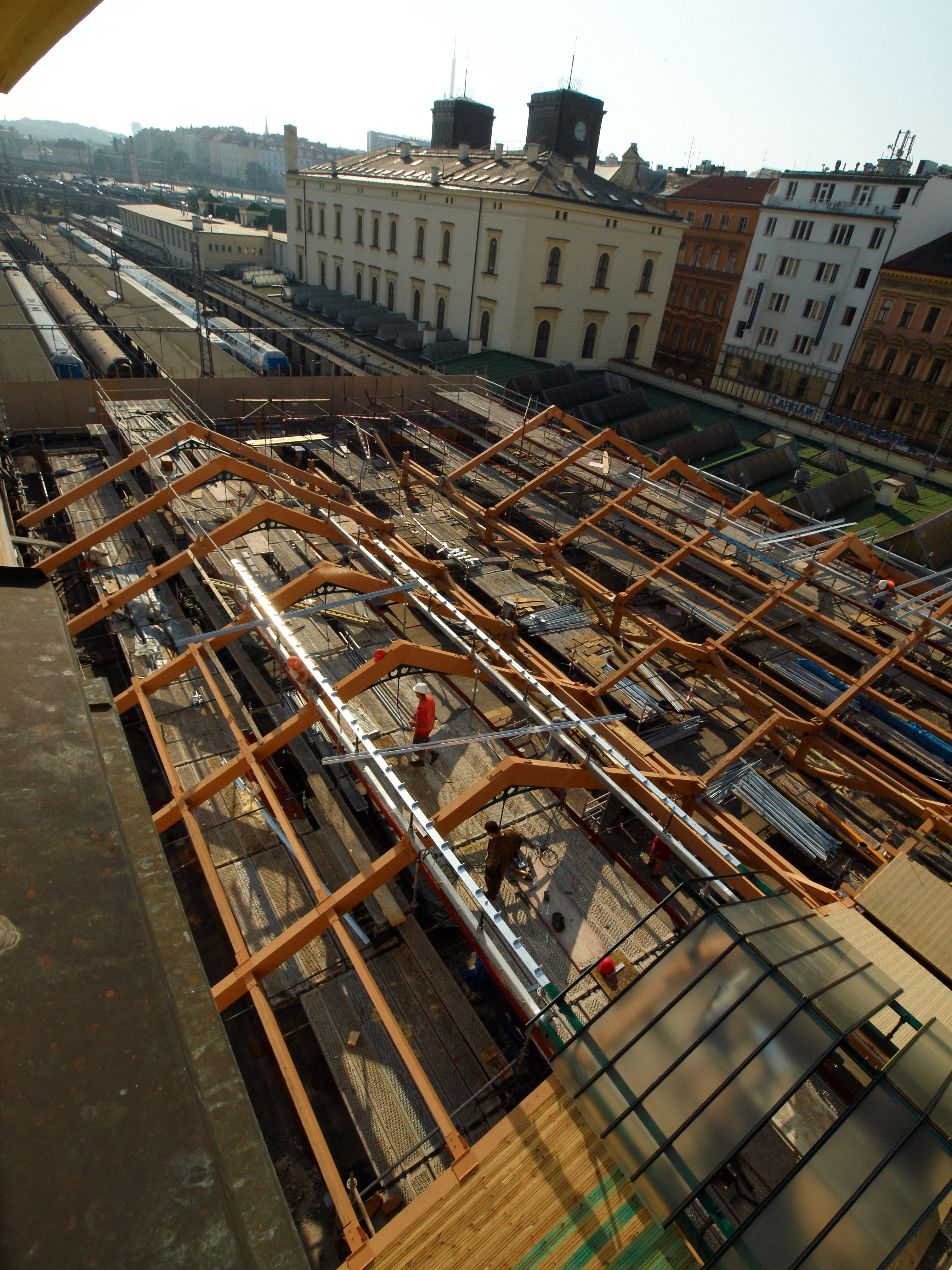 - posílení jednotlivých konstrukčních prvků a spojů (zachování stávajících dřevěných krokví ve středním poli, náhrada krokví bočních polí novými dřevěnými prvky opracovanými jako stávající, ponechání stávajících kovových botek pro uložení vazníků ve zdech, viditelné botky odlity nové, provedení nových betonových základových patek pod sloupy, podchycení sloupů mikropilotami, na základě zkoušek v Kloknerově ústavu ponechána většina stávajících litinových sloupů, náhrada tří sloupů poškozených trhlinami kopií sloupů původních, nové odlité hlavice sloupů podle jednoho nalezeného vzorku, vložení plastové trubky pro odvod vody do litinových sloupů a napojení na kanalizaci,),