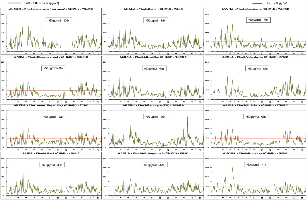 Imisní limit 24hodinové koncentrace PM10 byl v roce 2005 překročen více než 35x na 12 AMS ČHMÚ a jedné manuální stanici ZÚ v Praze.